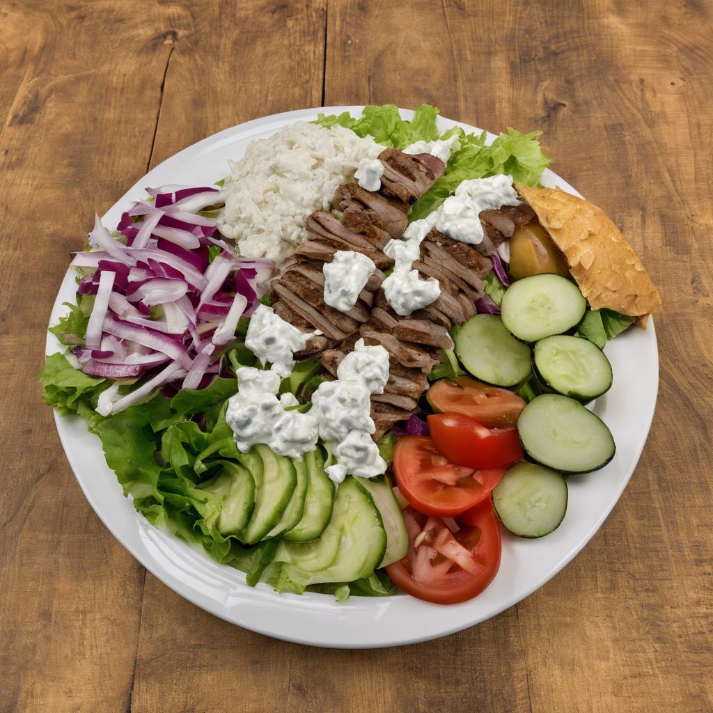 The Gyro Plate is a classic Greek dish that has become a staple in Mediterranean cuisine. Originating in Greece, this flavorful dish consists of thinly sliced, seasoned meat, typically lamb or beef, served with pita bread, tzatziki sauce, and a side of Greek salad. The history of the Gyro Plate dates back to ancient times, where it was a popular street food in Greece. Today, it can be found in Greek restaurants worldwide, with each chef adding their own unique touch to the dish. The best version of this dish can be found in authentic Greek tavernas, where the meat is traditionally cooked on a vertical rotisserie for that perfect charred flavor. The key to a delicious Gyro Plate lies in the tender, well-seasoned meat and the creamy, tangy tzatziki sauce. As for the Greek salad, it's a refreshing accompaniment, typically made with crisp lettuce, juicy tomatoes, cucumbers, olives, feta cheese, and a drizzle of olive oil and oregano. When prepared with fresh, high-quality ingredients, the Gyro Plate and Greek salad combination is a true taste of Greece.