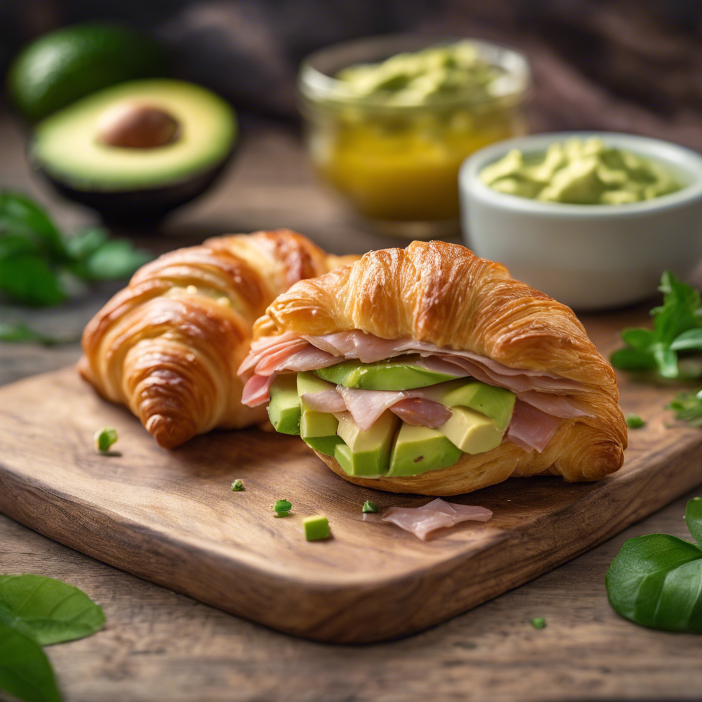 - Layer 2 slices of herb ham, 1 slice of cheese, and a few slices of avocado on top of the mustard and honey mixture on each croissant.