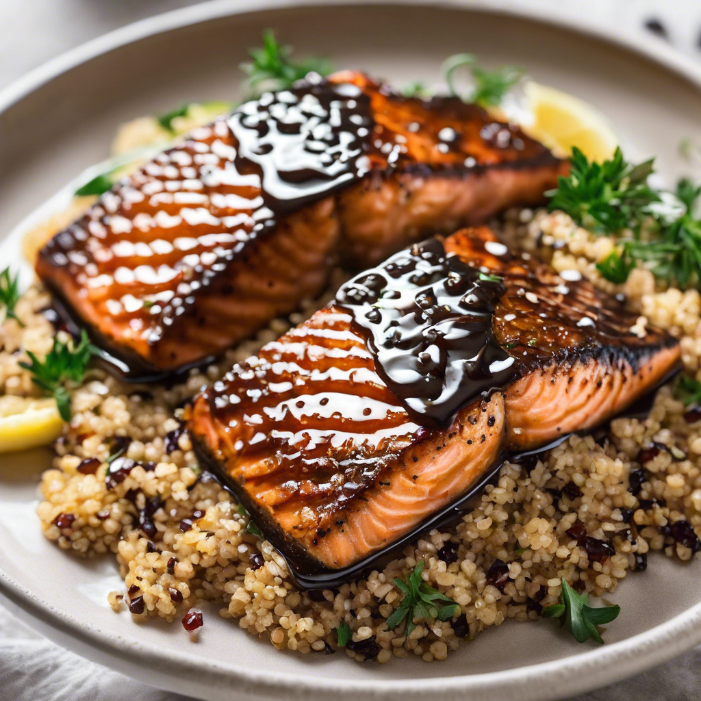 - To serve, spoon a generous portion of quinoa onto each plate. Top with a honey balsamic glazed salmon fillet. Drizzle any remaining glaze from the skillet over the salmon. Garnish with fresh parsley and serve immediately.
