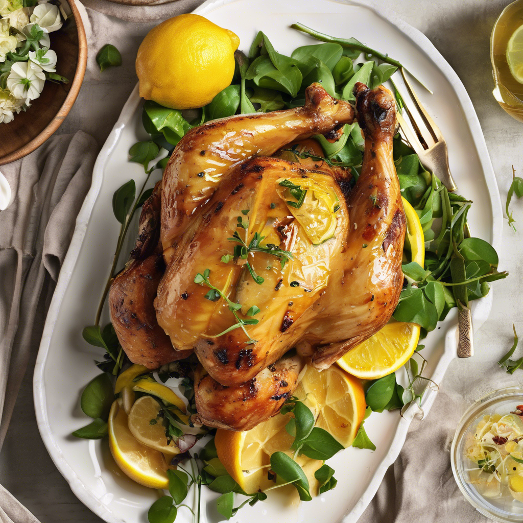 The Honey Glazed Lemon Garlic Roasted Chicken with a citrus salad is a delightful dish that combines the zesty flavors of lemon and garlic with the sweetness of honey. This dish has its roots in Mediterranean cuisine, where chefs have long perfected the art of roasting chicken to tender perfection. The citrus salad adds a refreshing and tangy contrast to the rich flavors of the chicken, making it a well-balanced and satisfying meal. Some renowned chefs, such as Jamie Oliver and Ina Garten, have popularized their versions of this dish, incorporating their unique twists and techniques. For the best version of this dish, sourcing high-quality, organic chicken and fresh, ripe citrus fruits is essential. The key to achieving the perfect balance of flavors lies in the marinade, where the chicken is infused with a blend of honey, lemon, and garlic before being roasted to golden perfection. This dish is a crowd-pleaser and is often served at family gatherings, special occasions, and upscale restaurants. Whether it's a Sunday roast or a celebratory feast, the Honey Glazed Lemon Garlic Roasted Chicken with a citrus salad is a timeless classic that never fails to impress.