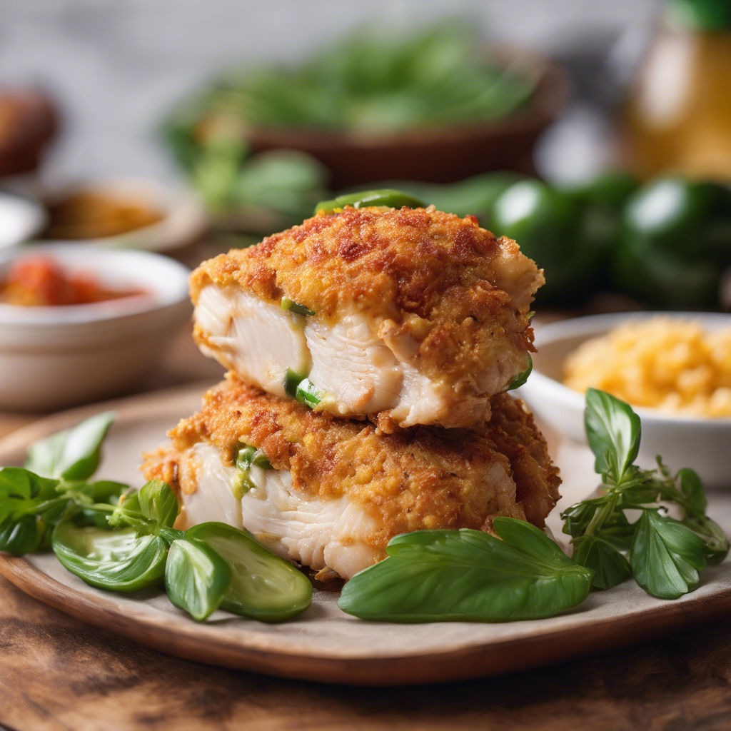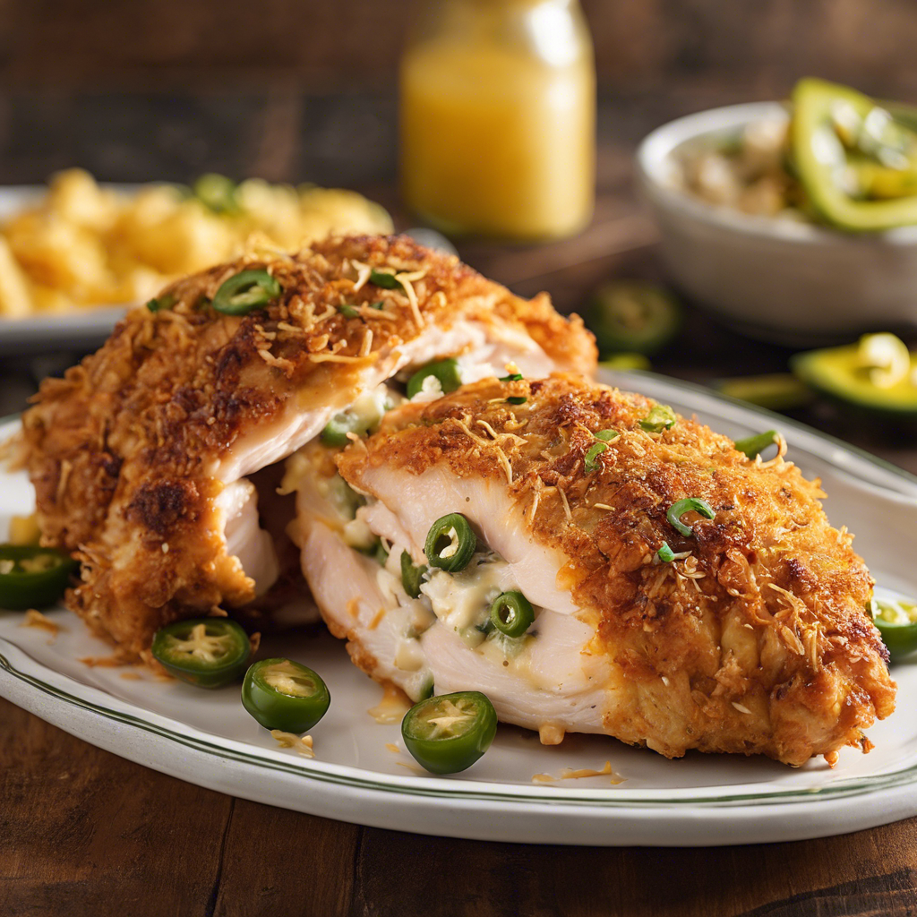 The Jalapeno Popper Stuffed Chicken with a crispy breadcrumb coating is a modern twist on a classic dish. This flavorful creation combines the heat of jalapenos with the richness of cream cheese, all stuffed inside a juicy chicken breast and coated with a crispy breadcrumb crust. This dish has gained popularity in recent years, especially in the United States, where it is often featured on the menus of trendy restaurants and food blogs. The origins of this dish can be traced back to the fusion of Tex-Mex and American cuisine, where the love for spicy flavors and comfort food collide. Chefs and home cooks alike have put their own spin on this dish, adding different ingredients and techniques to make it their own. To make the best version of this dish, it's important to get the stuffing just right. The combination of cream cheese, jalapenos, and sometimes bacon is what gives this dish its signature flavor. Additionally, achieving the perfect crispy breadcrumb coating is essential for a satisfying texture contrast. One famous alternative method for making this dish is to grill the chicken instead of baking it, adding a smoky flavor to the dish. This method is popular in regions known for their barbecue traditions, such as the southern United States. Today, the best versions of this dish can be found in restaurants that specialize in modern American cuisine, as well as in the kitchens of creative home cooks who are always looking for new ways to elevate classic recipes. Whether you're a fan of spicy food or just looking for a delicious and comforting meal, the Jalapeno Popper Stuffed Chicken with a crispy breadcrumb coating is sure to satisfy your cravings.