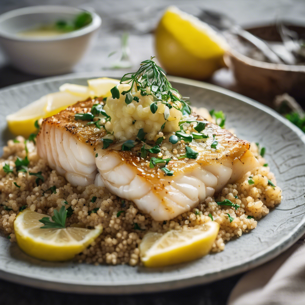 A delicious and healthy dish featuring tender baked cod with a flavorful lemon butter sauce served over a bed of fluffy quinoa.