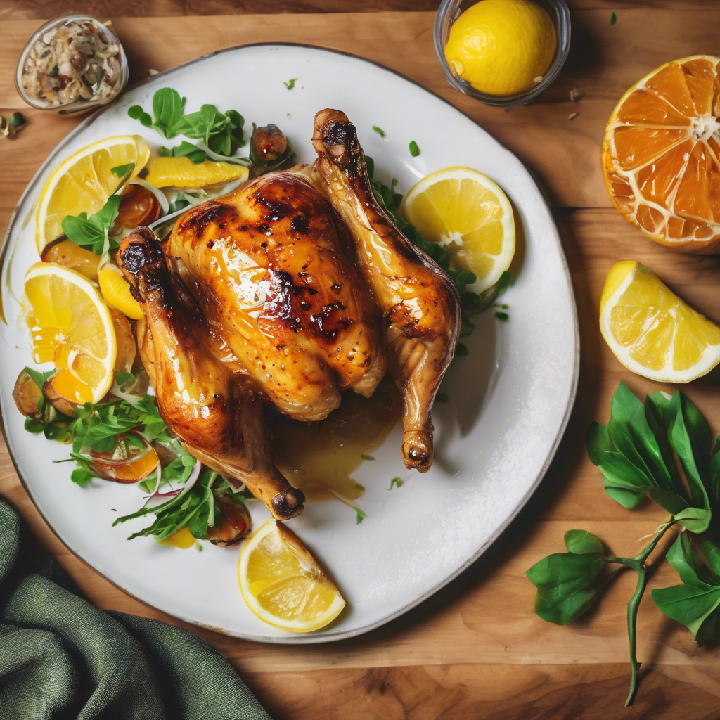 A delicious and flavorful roasted chicken with a sweet and tangy honey glaze, served with a refreshing citrus salad.