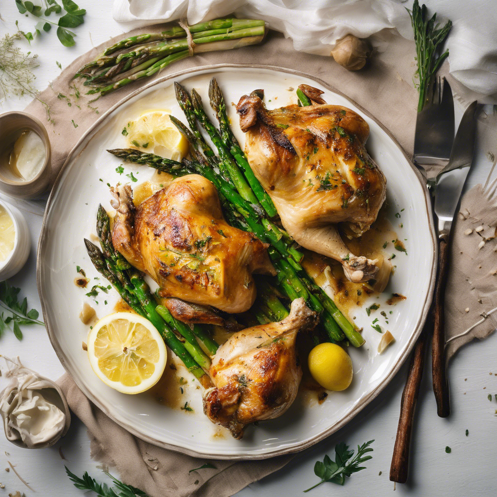 Lemon Garlic Roasted Chicken with Asparagus is a classic dish that has been enjoyed for generations. This flavorful and aromatic dish has its roots in Mediterranean cuisine, where the use of fresh herbs and citrus flavors is prominent. The dish is believed to have originated in Italy, where chefs would roast chicken with a blend of garlic, lemon, and herbs, and serve it alongside fresh, tender asparagus. Today, this dish can be found on the menus of many Italian and Mediterranean restaurants around the world. The key to a perfect Lemon Garlic Roasted Chicken with Asparagus lies in the quality of the ingredients. The chicken should be juicy and tender, marinated in a blend of fresh lemon juice, minced garlic, and fragrant herbs like rosemary and thyme. The asparagus should be crisp and vibrant, adding a pop of color and freshness to the dish. One famous alternative method for making this dish is to use a spatchcocked chicken, which involves removing the backbone of the chicken and flattening it before roasting. This method allows for more even cooking and crispy skin, resulting in a truly delicious and memorable meal. For the best version of this dish, look for a restaurant that sources high-quality, organic chicken and fresh, seasonal asparagus. The dish should be cooked to perfection, with the chicken golden and succulent, and the asparagus tender-crisp and bursting with flavor. Whether enjoyed at a cozy trattoria in Tuscany or a bustling Mediterranean bistro, Lemon Garlic Roasted Chicken with Asparagus is a timeless and beloved dish that continues to delight food lovers around the world.