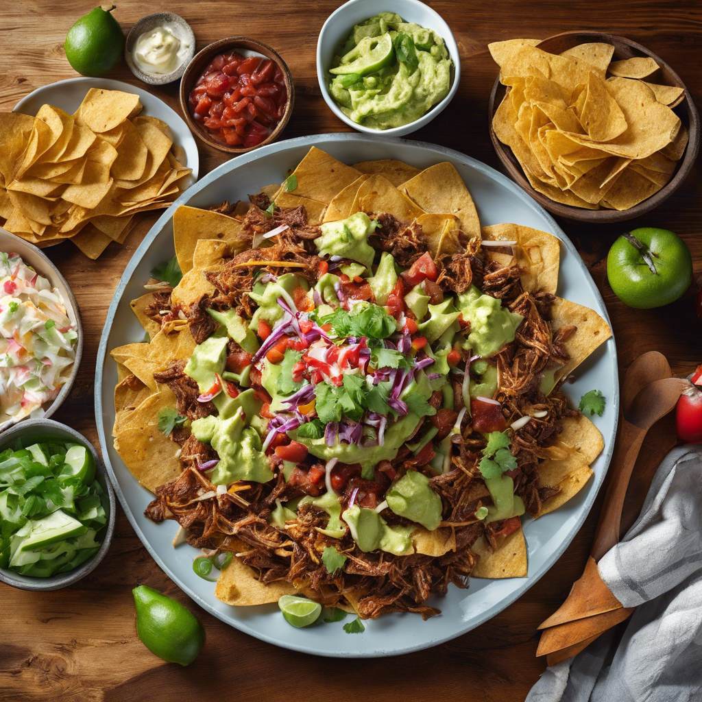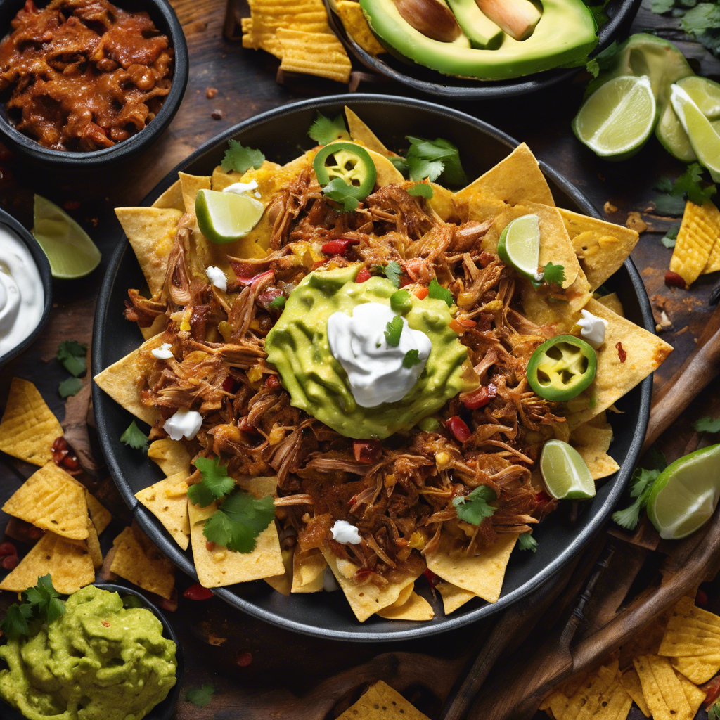 Loaded Pulled Pork Nachos with guacamole is a mouthwatering dish that combines the savory flavors of tender pulled pork, gooey melted cheese, zesty guacamole, and crunchy tortilla chips. This indulgent creation has its roots in the southern United States, where barbecue reigns supreme. The dish gained popularity in the 2000s as a fusion of Tex-Mex and barbecue cuisine, and has since become a staple in many restaurants and home kitchens. Chefs across the country have put their own spin on this dish, with some adding unique toppings like pickled jalapenos, black beans, or fresh pico de gallo. The key to perfecting this dish lies in the quality of the pulled pork, which should be tender, flavorful, and generously piled onto a bed of crispy tortilla chips. The guacamole adds a creamy and refreshing element that balances out the richness of the pork and cheese. One renowned spot for enjoying this delectable dish is in Austin, Texas, where the fusion of Tex-Mex and barbecue cuisine is celebrated. The best version of Loaded Pulled Pork Nachos with guacamole can be found at local barbecue joints and Tex-Mex eateries, where the chefs take pride in their slow-cooked pulled pork and house-made guacamole. For those looking to recreate this dish at home, sourcing high-quality pulled pork and ripe avocados for the guacamole is essential. The combination of smoky, tender pork, creamy guacamole, and crispy tortilla chips makes for a truly irresistible treat that is perfect for sharing with friends and family. Whether enjoyed as an appetizer or a main course, Loaded Pulled Pork Nachos with guacamole is sure to satisfy any craving for bold flavors and comforting textures.