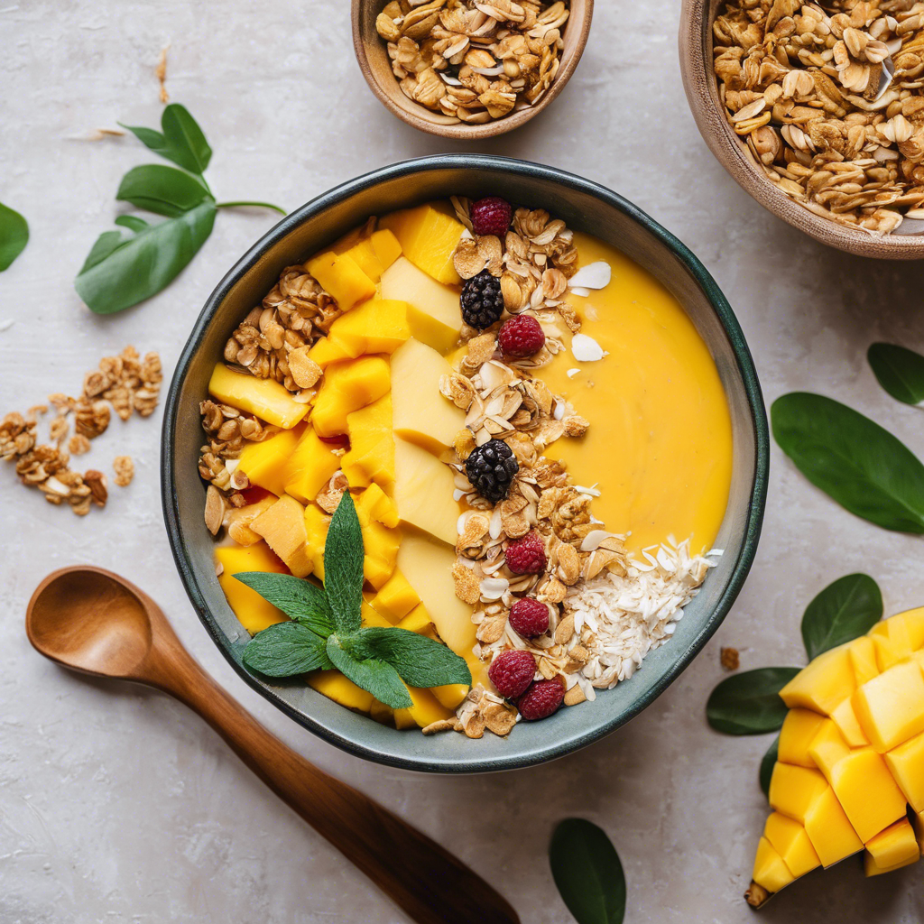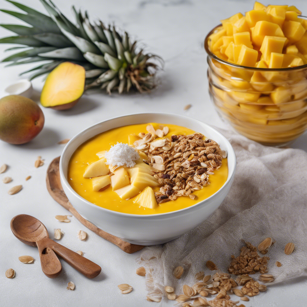The Mango Pineapple Smoothie Bowl is a tropical delight that has taken the health food world by storm. This vibrant and refreshing dish is a perfect blend of sweet and tangy flavors, with the creamy texture of the smoothie base complemented by the crunchy goodness of granola and the nutty sweetness of coconut flakes. Originating in the sunny regions of Hawaii and the Caribbean, this dish has become a staple in many beachside cafes and health-conscious eateries. Renowned chefs like Jamie Oliver and Nigella Lawson have popularized their own versions of this dish, adding their unique twists to the recipe. For the best version of this dish, sourcing ripe, juicy mangoes and tangy pineapples is crucial, as they are the stars of the show. The smoothie base should be thick and creamy, achieved by using frozen fruits and a splash of coconut milk. Topped with crunchy granola and a generous sprinkle of coconut flakes, this smoothie bowl is a feast for the senses, offering a burst of tropical flavors and a satisfying crunch in every spoonful. Whether enjoyed as a healthy breakfast, a post-workout snack, or a guilt-free dessert, the Mango Pineapple Smoothie Bowl is a delightful treat that transports you to a sunny paradise with every bite.