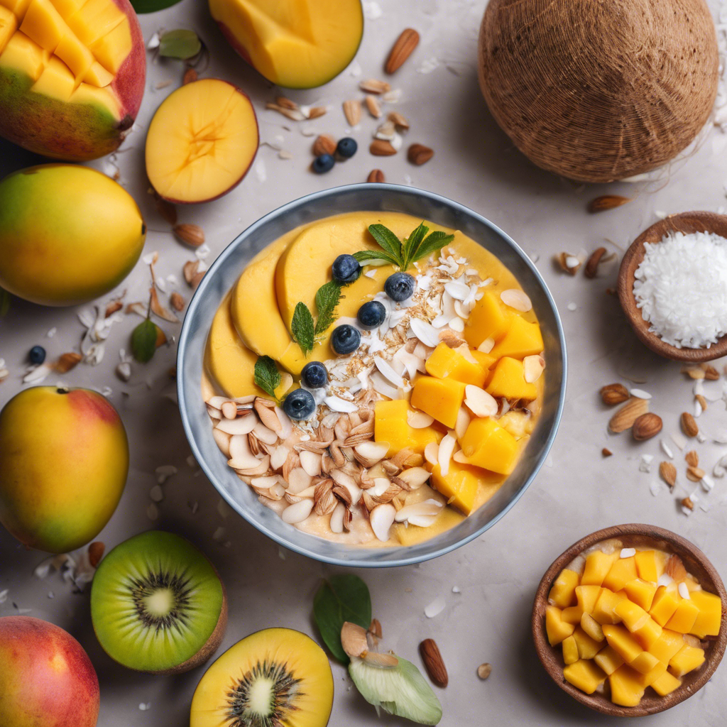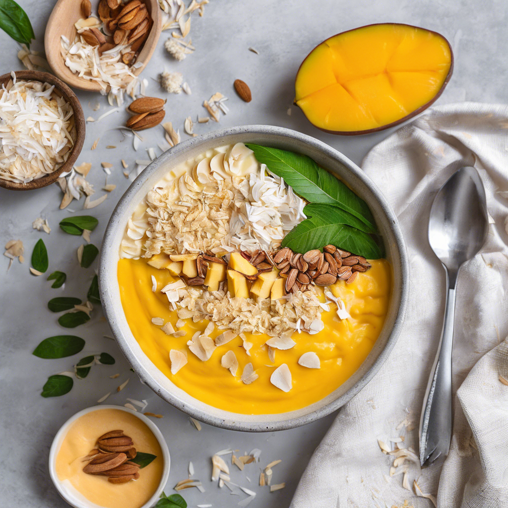 The Mango Protein Smoothie Bowl with Coconut Flakes is a tropical delight that originated in the vibrant culinary scene of Southeast Asia. This refreshing and nutritious dish gained popularity in health-conscious cafes and restaurants, where talented chefs combined ripe mangoes, protein-rich ingredients, and creamy coconut flakes to create a satisfying and visually stunning breakfast or snack. The smoothie bowl craze quickly spread to trendy eateries in coastal regions, where the abundance of fresh tropical fruits and coconuts inspired innovative variations of this dish. Today, the best versions of this bowl can be found in Bali, Hawaii, and other tropical destinations, where the use of locally sourced ingredients elevates the flavors to new heights. To make the perfect Mango Protein Smoothie Bowl with Coconut Flakes, it's essential to use ripe, sweet mangoes and high-quality protein powder for a creamy and indulgent texture. Alternatively, some chefs incorporate frozen bananas or Greek yogurt for added creaminess and depth of flavor. Whether enjoyed as a post-workout treat or a healthy dessert, this delightful smoothie bowl is a delicious celebration of tropical flavors and wholesome ingredients.
