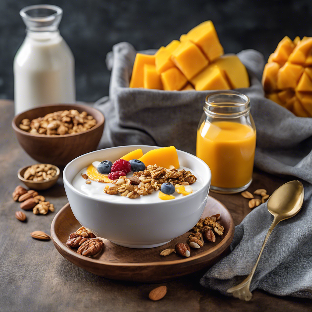 The Mango Yogurt Bowl with added granola and nuts is a delightful and nutritious dish that has gained popularity in recent years. This refreshing and satisfying breakfast or snack option combines the sweetness of ripe mangoes with the creamy texture of yogurt, and the crunch of granola and nuts. This dish has its origins in the health-conscious food scene, with chefs and health enthusiasts experimenting with different combinations of fruits, dairy, and crunchy toppings. The addition of granola and nuts provides a satisfying texture and a boost of protein and healthy fats. This dish can be found in trendy cafes and health-focused restaurants, particularly in regions known for their abundance of fresh fruits and artisanal dairy products. The best versions of this dish can be found in tropical regions where mangoes are abundant and at their peak of ripeness. When making this dish at home, it's important to use ripe, juicy mangoes and high-quality yogurt to achieve the perfect balance of flavors and textures. Some alternative methods for making this dish include using different types of nuts or adding a drizzle of honey for extra sweetness. Whether enjoyed as a quick breakfast or a post-workout snack, the Mango Yogurt Bowl with granola and nuts is a delicious and nutritious choice for any time of day.