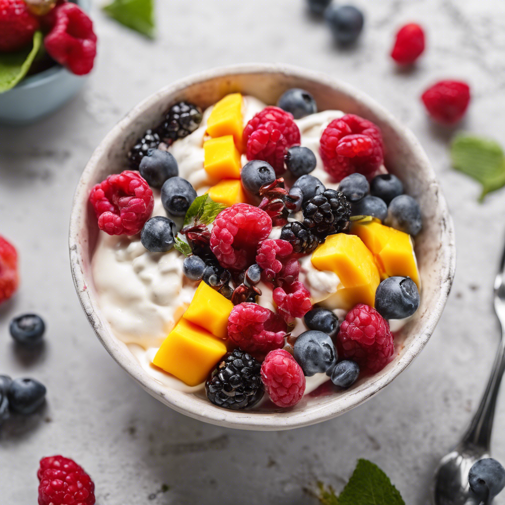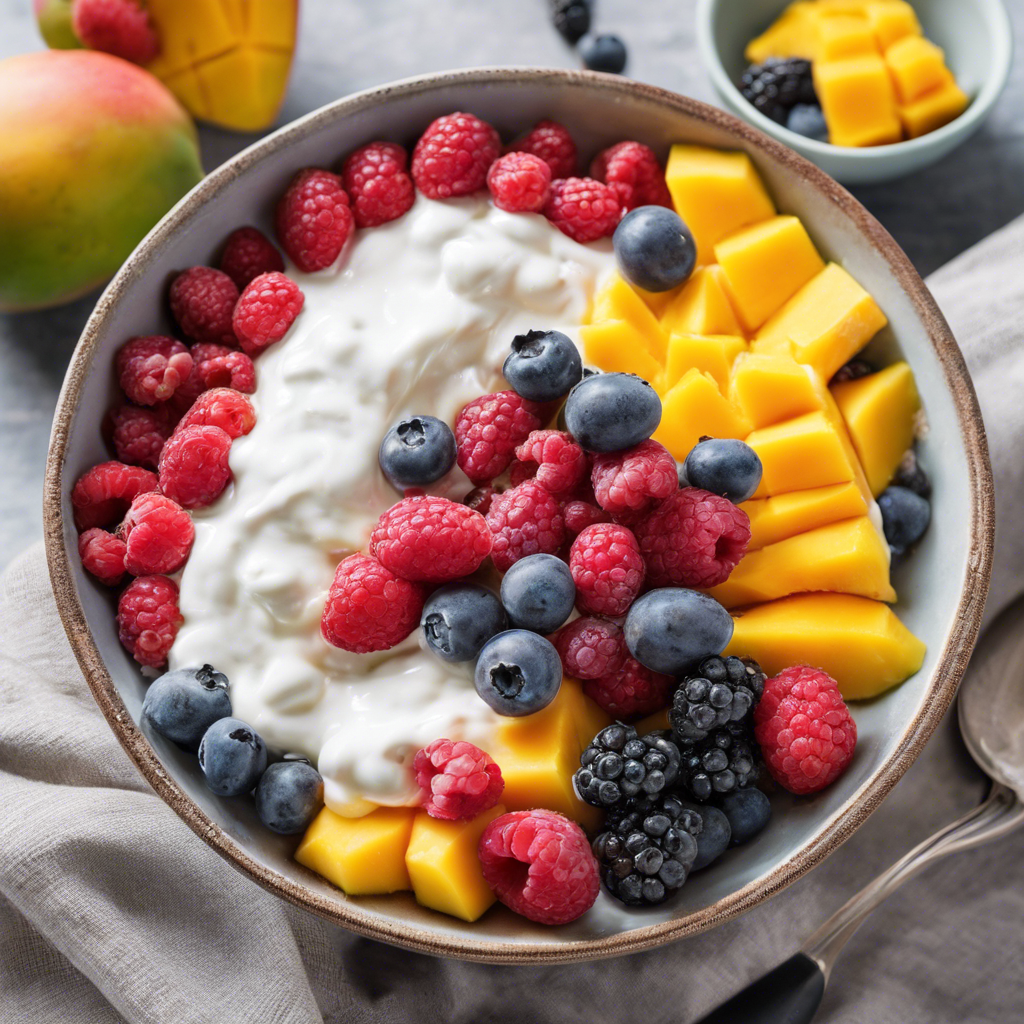 The Mango Yogurt Bowl with mixed berries topping is a delightful and refreshing dish that has gained popularity in recent years. This healthy and vibrant bowl features creamy yogurt blended with ripe mangoes, creating a luscious base. The addition of mixed berries on top adds a burst of tartness and sweetness, elevating the flavor profile. This dish has its roots in the health-conscious food scene, with chefs and restaurants across the globe embracing the trend. The best versions of this dish can be found in tropical regions where mangoes and berries are abundant, ensuring the freshest and most flavorful ingredients. The key to perfecting this dish lies in sourcing ripe, juicy mangoes and a variety of fresh, plump berries. Whether enjoyed as a breakfast treat or a light dessert, the Mango Yogurt Bowl with mixed berries topping is a delightful fusion of flavors and textures that is sure to tantalize the taste buds.