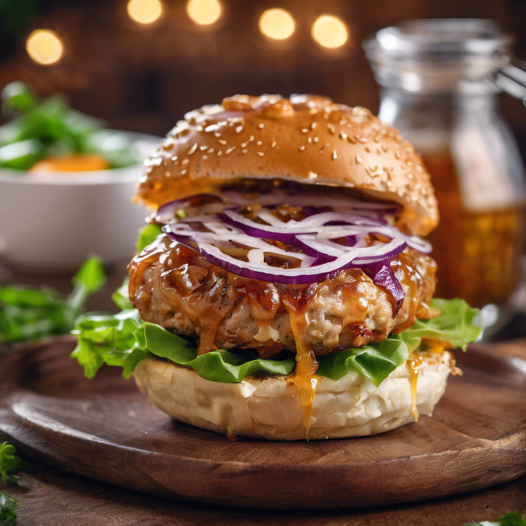 A delicious and savory turkey burger served on a pretzel bun with caramelized onions and Swiss cheese.