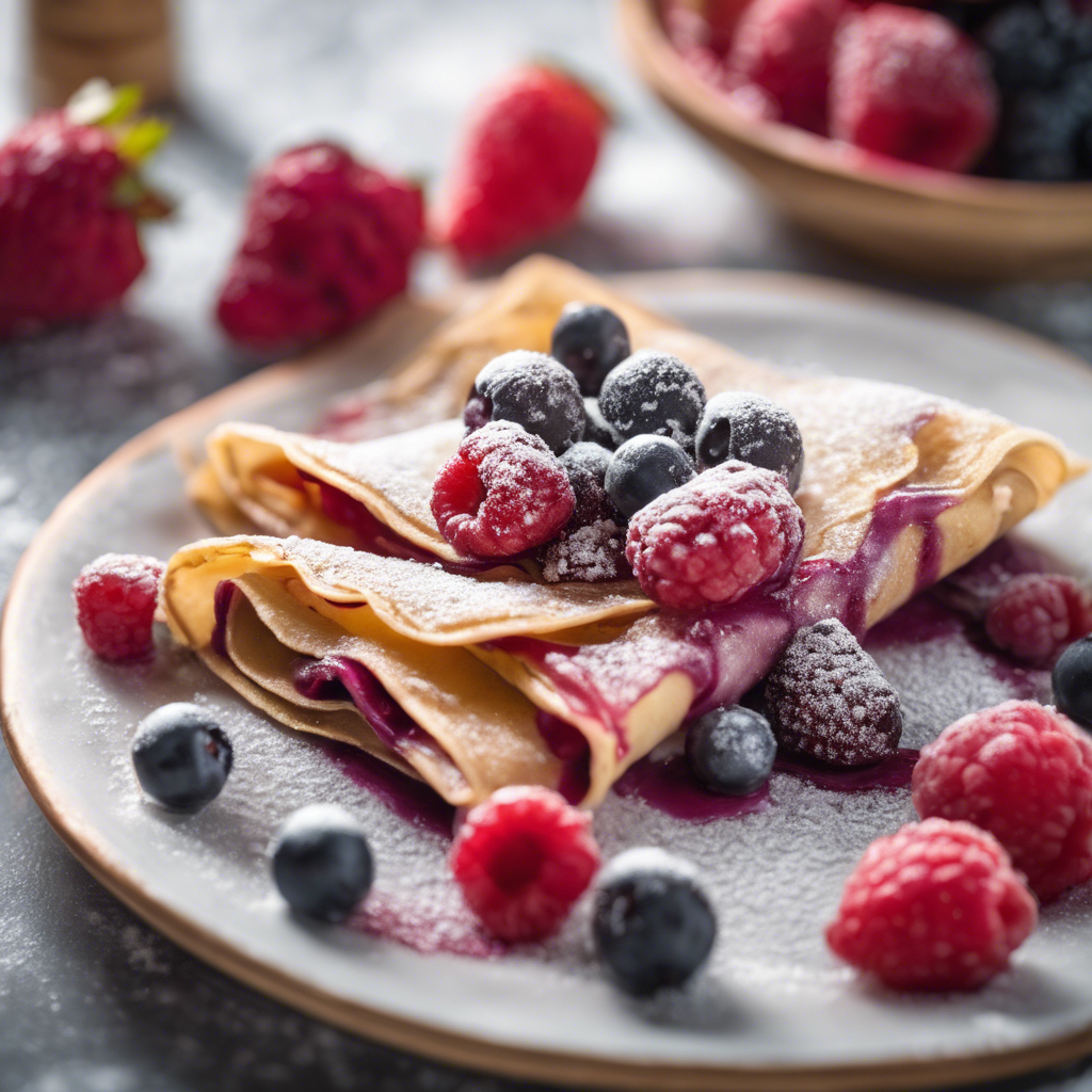 Mixed Berry Crepes are a delightful French-inspired dish that has become a beloved breakfast and dessert option worldwide. The history of this dish can be traced back to the Brittany region of France, where crepes have been a staple for centuries. The thin, delicate pancakes are filled with a luscious mixture of fresh mixed berries, such as strawberries, blueberries, and raspberries, creating a burst of sweet and tangy flavors. The addition of a sprinkle of powdered sugar adds a touch of sweetness and a beautiful presentation. Renowned chefs and restaurants, such as the famous La Crêperie in Paris, have perfected the art of making these delectable crepes. Today, the best versions of Mixed Berry Crepes can be found in authentic French patisseries and brunch spots, where skilled chefs expertly craft the perfect balance of tender crepes and vibrant berry filling. To make this dish at home, it's crucial to master the technique of creating thin, uniform crepes and to use the freshest, ripest berries available. For a unique twist, some recipes call for a drizzle of berry coulis or a dollop of whipped cream to elevate the flavors even further. Whether enjoyed as a breakfast treat or a decadent dessert, Mixed Berry Crepes with a sprinkle of powdered sugar are a delightful indulgence that captures the essence of French culinary artistry.