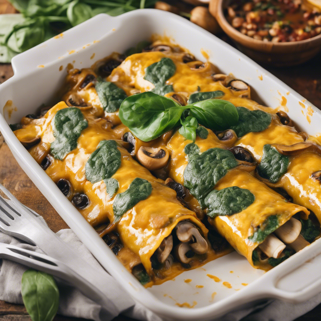 - Divide the mushroom and spinach filling evenly among the 8 flour tortillas. Roll up each tortilla and place seam-side down in the baking dish.