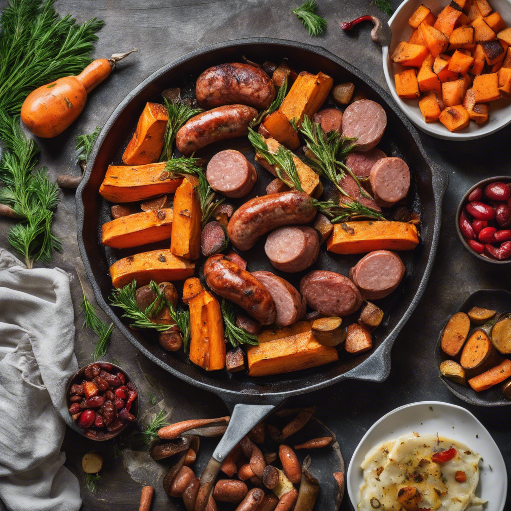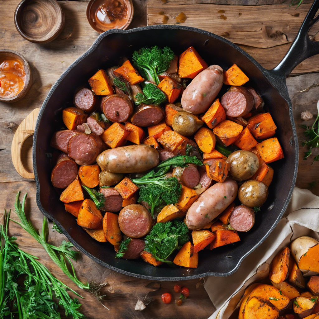 The One-Pan Sausage and Veggie Roast with roasted sweet potatoes is a hearty and flavorful dish that has its roots in rustic, home-cooked meals. This dish has gained popularity in recent years for its simplicity and delicious combination of ingredients. The dish typically includes savory sausages, colorful and nutritious vegetables, and sweet, caramelized roasted sweet potatoes, all cooked together on a single pan for easy cleanup. This dish has become a favorite among home cooks and has also found its way onto the menus of many restaurants and cafes. Chefs and home cooks alike have put their own spin on the dish, adding different seasonings, herbs, and spices to enhance the flavors. The dish is often associated with comfort food and is a popular choice for family dinners and gatherings. The best versions of this dish can be found in farm-to-table restaurants and cozy, neighborhood eateries that prioritize fresh, locally sourced ingredients. The key to getting this dish right lies in the quality of the sausages and the freshness of the vegetables. The sweet potatoes, in particular, play a crucial role in adding a touch of sweetness and earthiness to the dish. An alternative method for making this dish involves using different types of sausages, such as spicy Italian sausage or smoky chorizo, to add a unique flavor profile. Additionally, some recipes call for the addition of a tangy balsamic glaze or a sprinkle of fresh herbs to elevate the dish even further. Whether enjoyed at a bustling restaurant or prepared at home, the One-Pan Sausage and Veggie Roast with roasted sweet potatoes is a satisfying and wholesome meal that continues to delight food enthusiasts around the world.