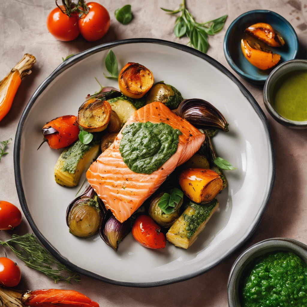 Pan-Seared Salmon with Pesto Sauce and Roasted Vegetables