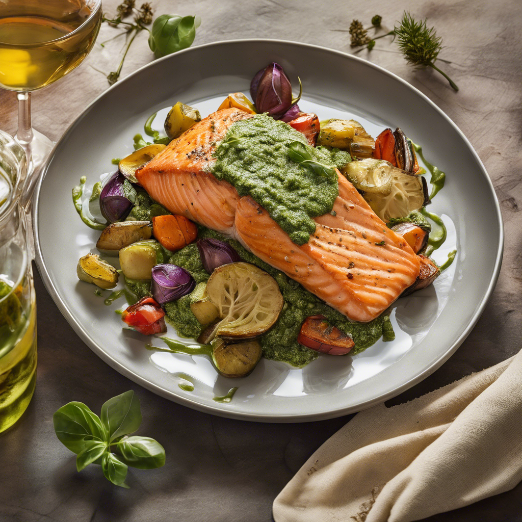 The history of Pan-Seared Salmon with Pesto Sauce and Roasted Vegetables can be traced back to the Mediterranean region, where fresh seafood and vibrant herbs are abundant. This dish combines the succulent flavors of pan-seared salmon with the aromatic essence of pesto sauce and the earthy goodness of roasted vegetables. Renowned chefs like Jamie Oliver and Ina Garten have popularized this dish, infusing it with their own unique twists and techniques. Today, the best versions of this dish can be found in upscale seafood restaurants and farm-to-table eateries, where the emphasis is on using high-quality, sustainable ingredients. The key to perfecting this dish lies in sourcing the freshest salmon, crafting a flavorful pesto sauce, and roasting the vegetables to tender perfection. Whether it's served at a coastal bistro or a cozy countryside inn, Pan-Seared Salmon with Pesto Sauce and Roasted Vegetables is a delightful culinary experience that celebrates the bounties of land and sea.