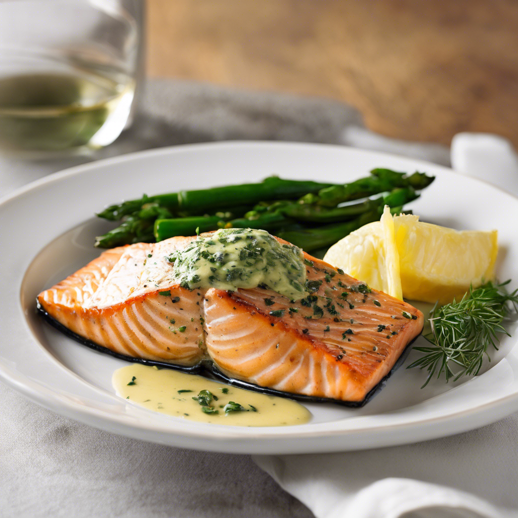 Pan-Seared Salmon with Herb Butter is a classic dish that has its roots in the culinary traditions of coastal regions around the world. The dish features a fresh salmon fillet, seasoned with salt and pepper, then seared to perfection in a hot pan. The herb butter, made with a blend of fresh herbs like dill, parsley, and chives, adds a burst of flavor and richness to the dish. This delectable combination of tender, flaky salmon and aromatic herb butter has become a favorite in fine dining restaurants and home kitchens alike. Chefs like Gordon Ramsay and Jamie Oliver have popularized this dish, showcasing their unique twists on the recipe. For the best version of this dish, seek out restaurants in coastal regions known for their fresh seafood, such as Seattle, Vancouver, or coastal regions in Europe. The key to getting this dish right lies in using high-quality, fresh salmon and a flavorful herb butter. An alternative method for making this dish is to grill the salmon instead of pan-searing it, which imparts a delightful smoky flavor. Whether you're a seafood enthusiast or a home cook looking to impress, Pan-Seared Salmon with Herb Butter is a must-try dish that never fails to delight the senses.