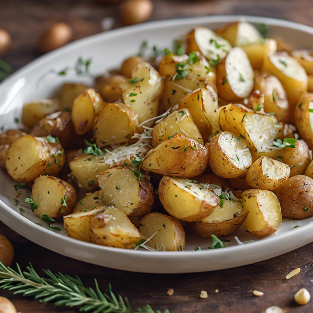 - In a large bowl, toss 2 pounds of halved baby potatoes with 3 tablespoons of olive oil, 4 cloves of minced garlic, 1/2 cup of grated parmesan cheese, 1 teaspoon of dried thyme, 1 teaspoon of dried rosemary, and salt and pepper to taste until the potatoes are evenly coated.