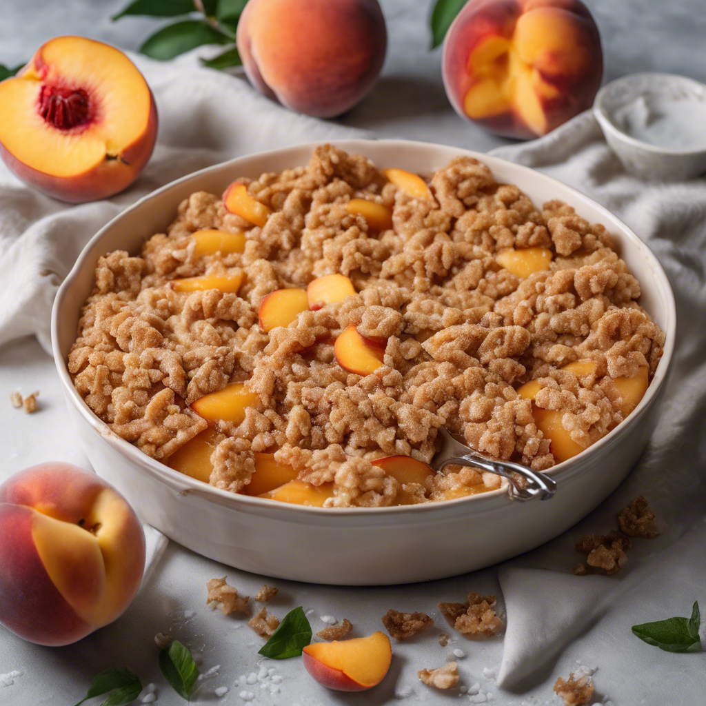 - Sprinkle the crumble mixture evenly over the peaches in the baking dish.