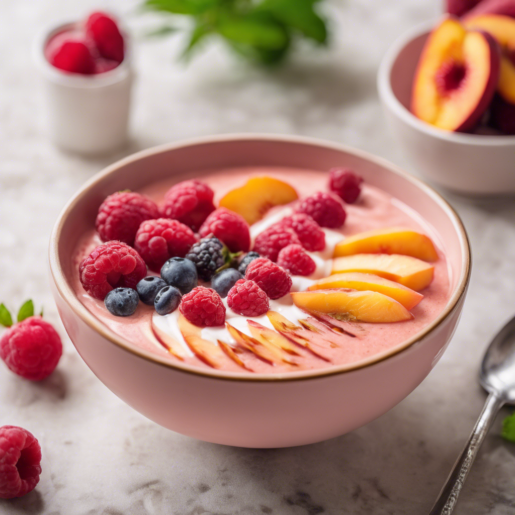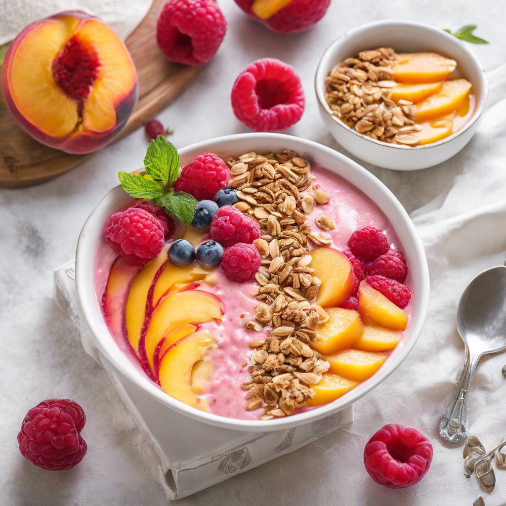 The Peach Raspberry Smoothie Bowl is a delightful and refreshing dish that has gained popularity in the health and wellness community. This vibrant and colorful bowl is a perfect blend of sweet peaches and tangy raspberries, creating a burst of flavor with every spoonful. Originating from the trend-setting cafes and juice bars of California, this smoothie bowl has become a staple for health-conscious foodies. Chefs and food enthusiasts have embraced this dish for its nutritious ingredients and beautiful presentation. To make the best Peach Raspberry Smoothie Bowl, it's essential to use ripe, juicy peaches and fresh, plump raspberries. This dish is often topped with granola, coconut flakes, and a drizzle of honey for added texture and sweetness. For a unique twist, some recipes incorporate spinach or kale for an extra boost of nutrients. Whether enjoyed for breakfast or as a refreshing snack, the Peach Raspberry Smoothie Bowl is a delicious way to indulge in a healthy treat.