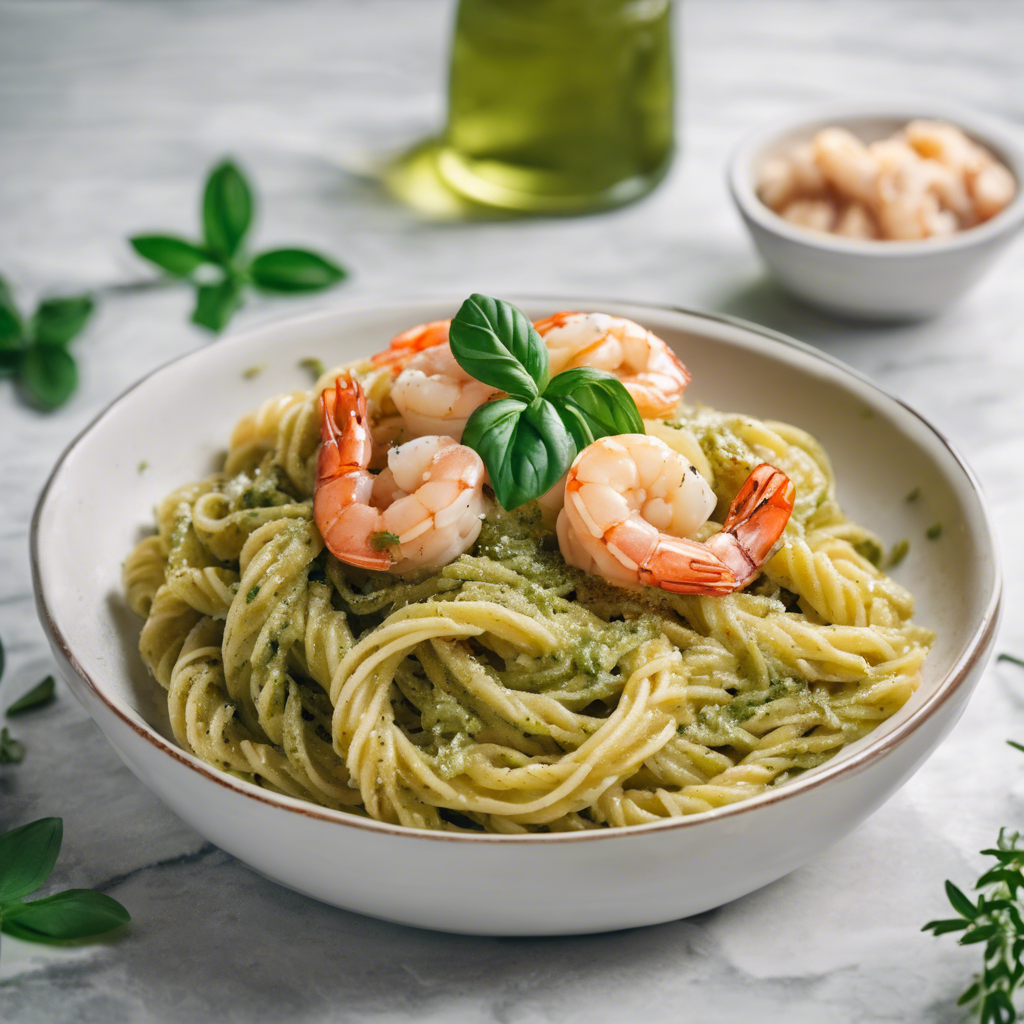 Pesto Pasta with Shrimp is a classic Italian dish that has been enjoyed for centuries. The dish originated in the Liguria region of Italy, where pesto sauce made from fresh basil, pine nuts, garlic, olive oil, and Parmesan cheese is a staple. The addition of succulent shrimp adds a delightful seafood twist to this traditional pasta dish. The extra Parmesan cheese enhances the rich and creamy flavor of the pesto, creating a truly indulgent experience. Renowned chefs like Lidia Bastianich and Giada De Laurentiis have popularized this dish in their restaurants and cooking shows, showcasing the perfect balance of flavors and textures. Today, the best versions of this dish can be found in authentic Italian trattorias and seafood restaurants, where the quality of the ingredients is paramount. To make this dish at home, it's crucial to use high-quality Parmesan cheese and fresh, plump shrimp to achieve the best results. Alternatively, some chefs also incorporate a touch of lemon zest or a sprinkle of red pepper flakes to add a zesty kick to the dish. Whether enjoyed in a cozy Italian eatery or prepared in your own kitchen, Pesto Pasta with Shrimp and extra Parmesan cheese is a delightful culinary experience that captures the essence of Italian coastal cuisine.