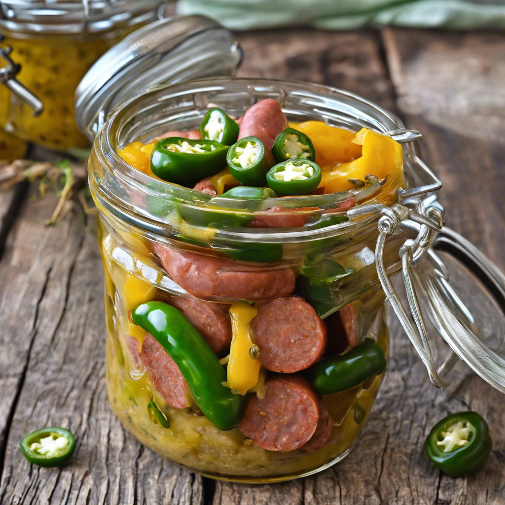 Pickled Sausage in Jar with Spicy Mustard and Jalapenos