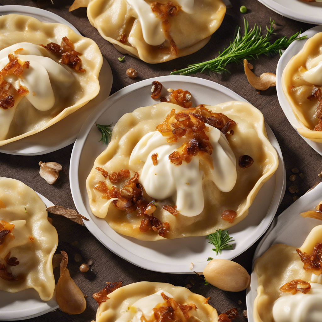 - Serve the pierogi topped with caramelized onions and a dollop of sour cream. Enjoy!