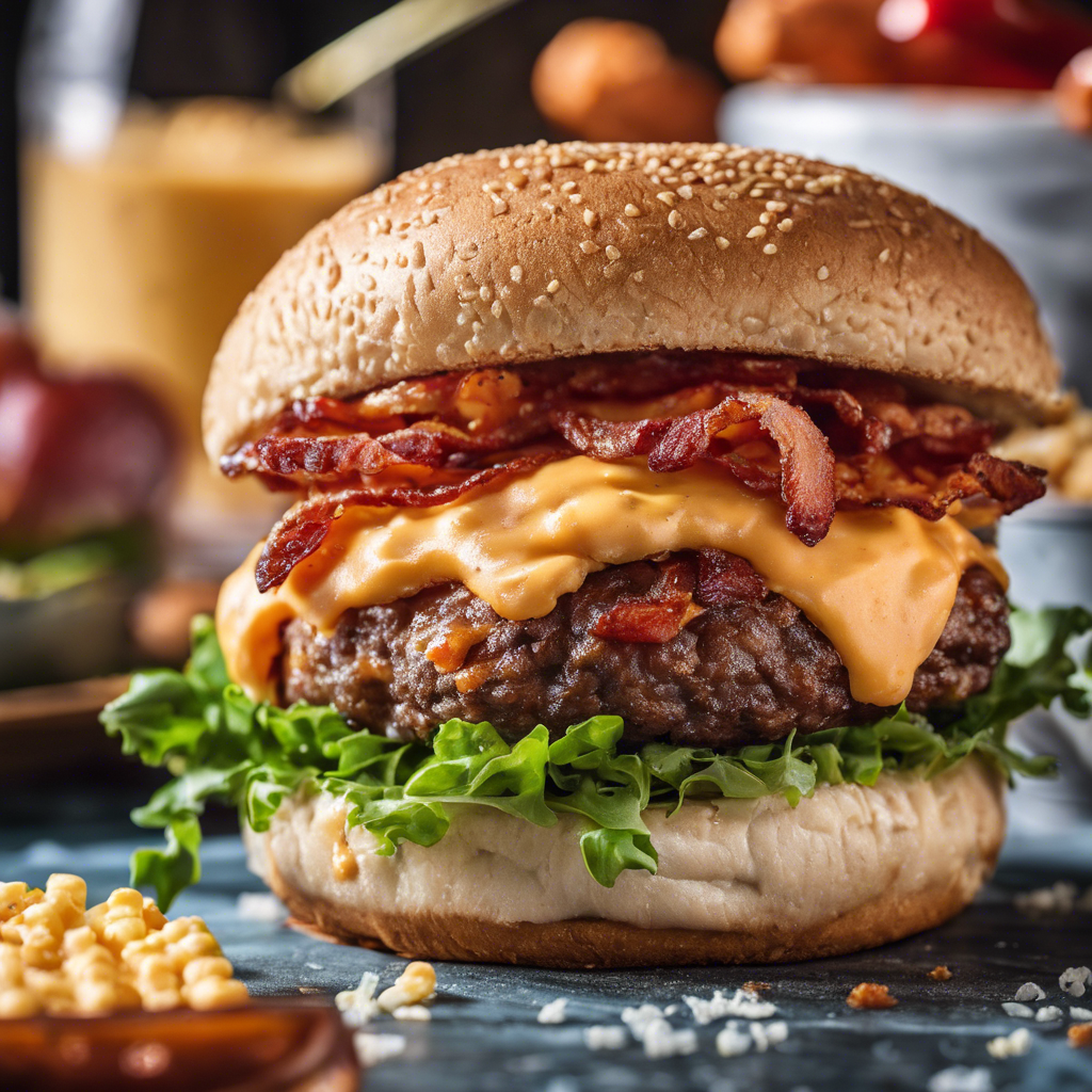 The Pimento Cheese Bacon Burger with a spicy chipotle mayo is a Southern-inspired culinary delight that has gained popularity across the United States. This mouthwatering burger features a juicy patty topped with creamy pimento cheese, crispy bacon, and a zesty chipotle mayo, all sandwiched between a toasted bun. The dish has its roots in the Southern states, where pimento cheese is a beloved staple. Chefs and home cooks alike have put their own spin on this classic, adding the smoky heat of chipotle to elevate the flavors. Today, the best versions of this burger can be found in Southern-inspired eateries and gastropubs, where the rich, tangy pimento cheese perfectly complements the smoky bacon and spicy mayo. When making this dish at home, it's crucial to get the pimento cheese just right, as it's the star of the show. Some alternative methods for making this dish include using different types of cheese in the pimento spread or experimenting with various levels of spiciness in the chipotle mayo. Whether enjoyed in a cozy Southern diner or whipped up in your own kitchen, the Pimento Cheese Bacon Burger with a spicy chipotle mayo is a true celebration of bold, comforting flavors.