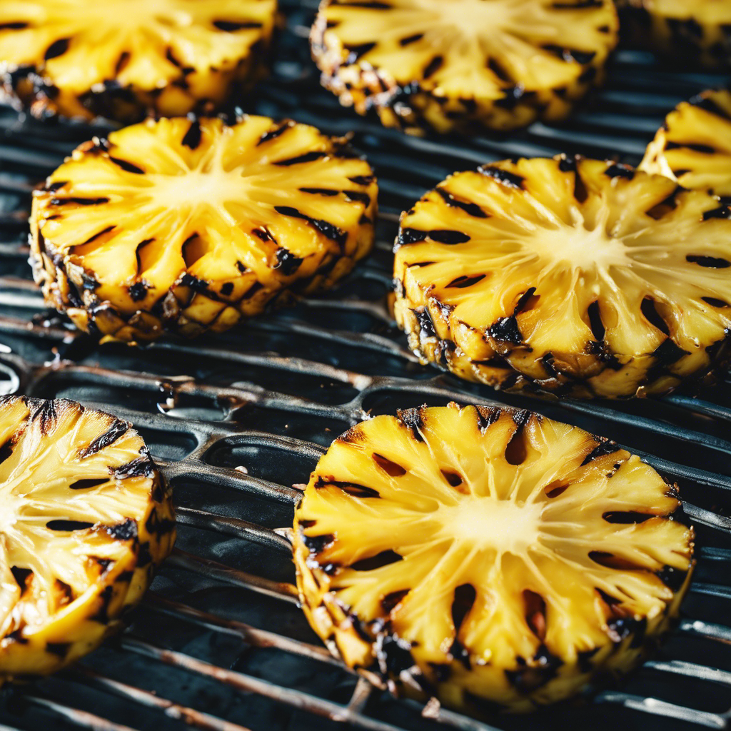 - Place the pineapple slices on the preheated grill and cook for 3-4 minutes on each side, or until grill marks appear and the pineapple is heated through.