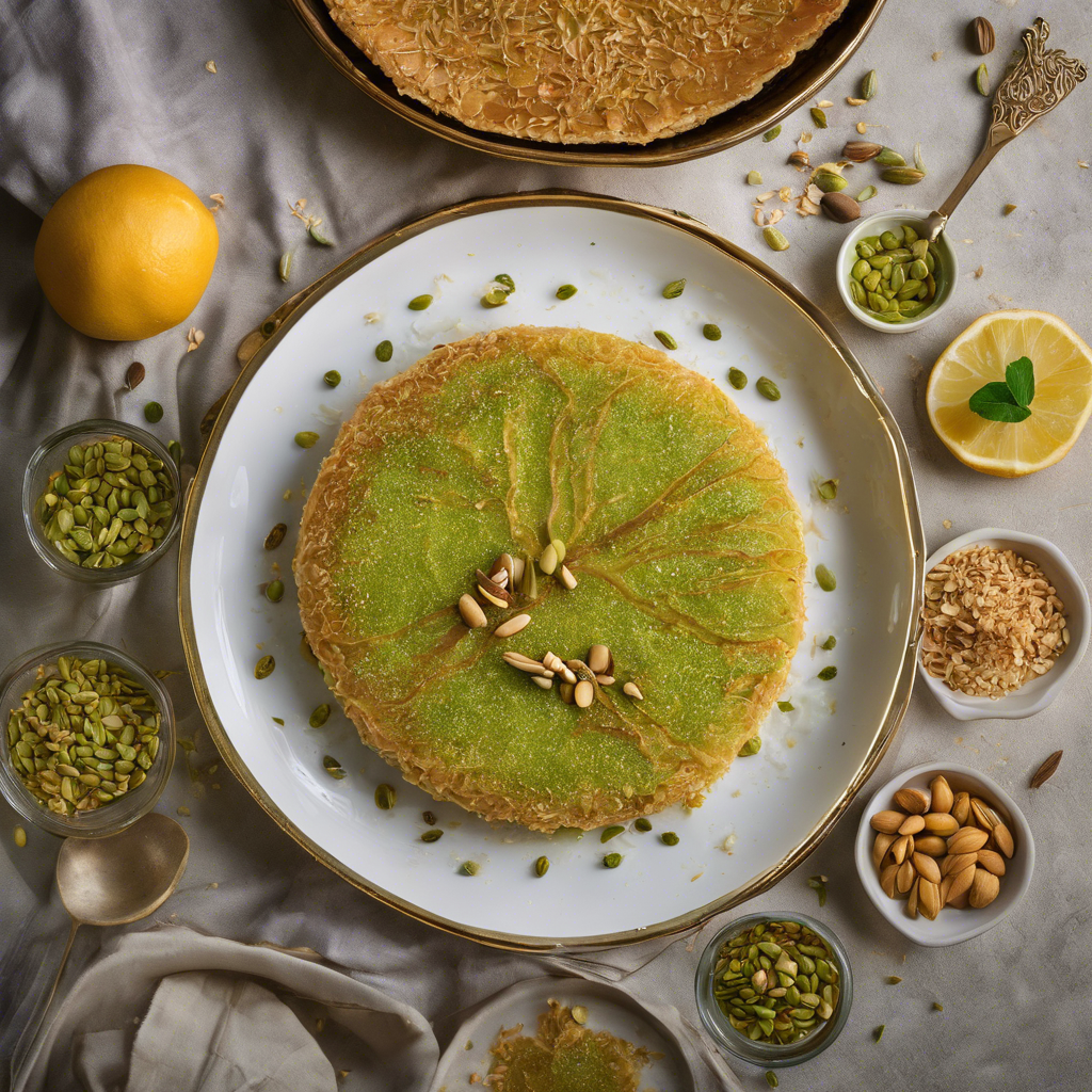 A delicious Middle Eastern dessert made with shredded phyllo dough, filled with a creamy pistachio mixture, and topped with a sprinkle of crushed pistachios.