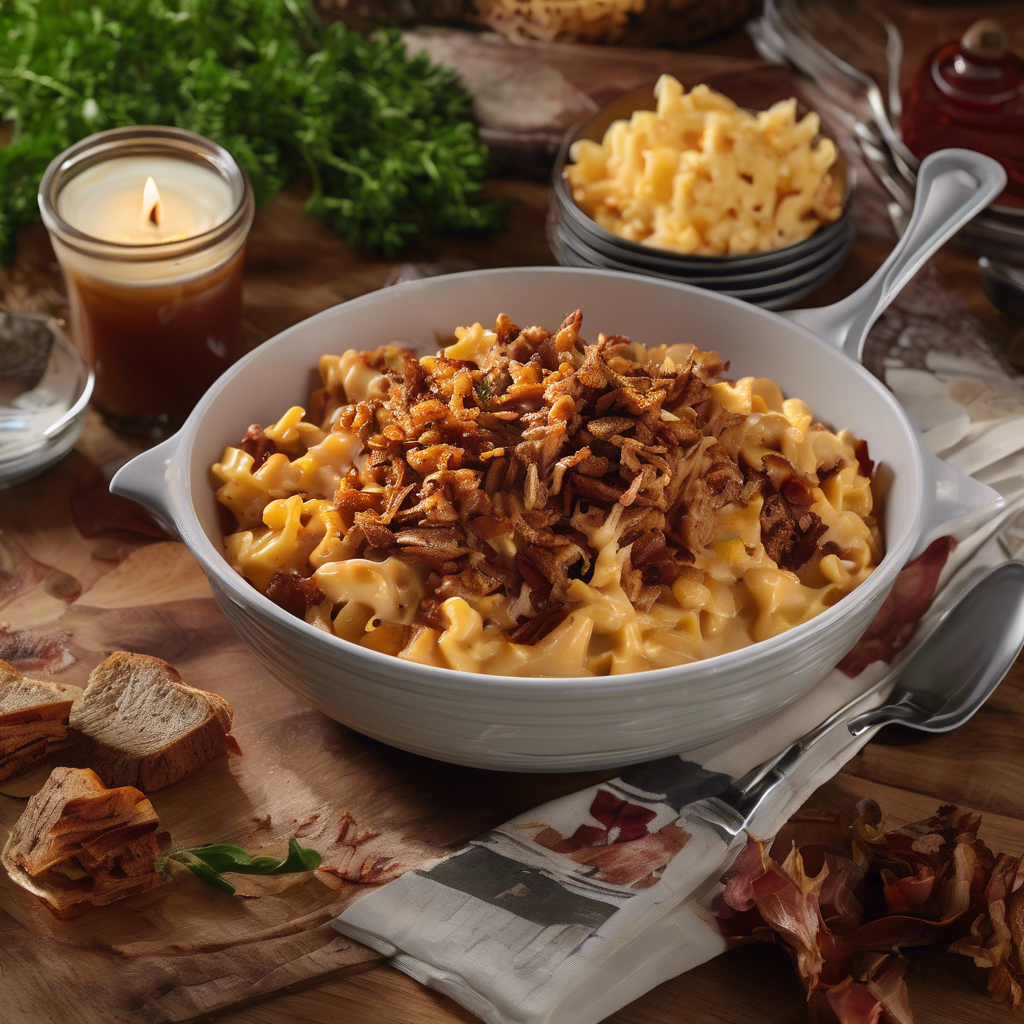 Pulled Pork Mac and Cheese with crispy bacon topping is a mouthwatering fusion of two beloved comfort foods. This indulgent dish has its roots in the American South, where slow-cooked pulled pork and creamy mac and cheese are culinary staples. The marriage of tender, smoky pulled pork with rich, cheesy macaroni is a match made in heaven. The addition of crispy bacon on top adds a delightful crunch and an extra layer of savory flavor. Chefs across the country have put their own spin on this classic, creating variations that range from traditional to innovative. For the best version of this dish, head to barbecue joints in the South, where pitmasters expertly smoke the pork to perfection and craft velvety mac and cheese. The key to nailing this dish lies in achieving the ideal balance of tender pulled pork, creamy cheese sauce, and crispy bacon. Whether enjoyed as a hearty main course or a decadent side dish, Pulled Pork Mac and Cheese with crispy bacon topping is a true indulgence for the senses.
