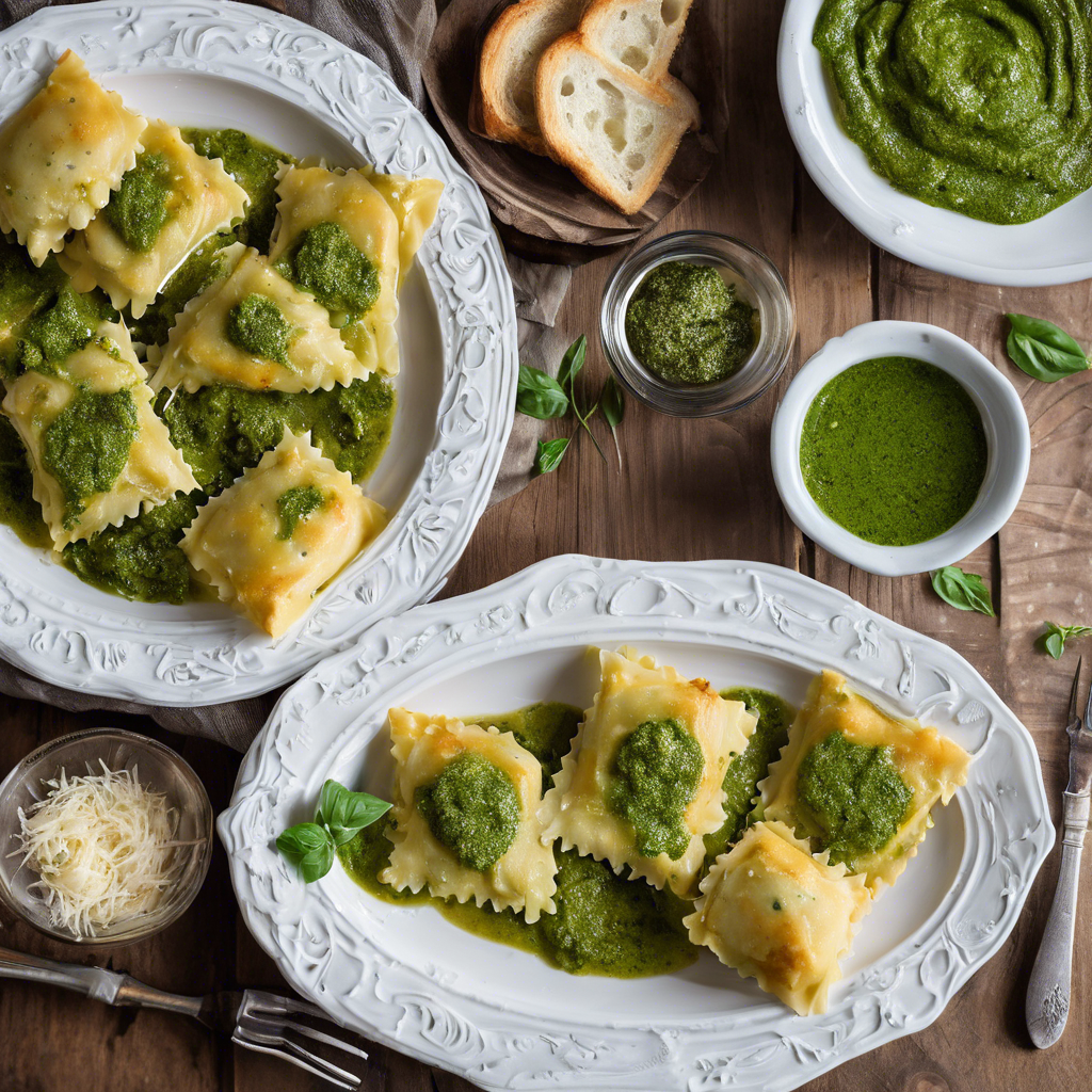 Ravioli with Pesto Sauce is a classic Italian dish that has been enjoyed for centuries. The origins of ravioli can be traced back to the 14th century in the Italian region of Liguria, where it was first created by a skilled group of chefs. The dish consists of delicate pockets of pasta filled with a savory mixture of cheese, herbs, and sometimes meat, and then topped with a vibrant and flavorful pesto sauce made from fresh basil, pine nuts, garlic, and olive oil. The addition of a side of garlic bread perfectly complements the dish, providing a crunchy and garlicky contrast to the soft and creamy ravioli. The combination of flavors and textures makes this meal a favorite among Italian food enthusiasts. One of the best places to enjoy this delectable dish is in the charming coastal town of Cinque Terre, where the freshest ingredients are used to create an authentic and unforgettable dining experience. The key to a perfect ravioli with pesto sauce lies in the quality of the ingredients, particularly the basil and olive oil, which should be of the highest quality to achieve the most vibrant and aromatic pesto sauce. For those looking to put a unique twist on this classic dish, consider adding a sprinkle of toasted pine nuts or a drizzle of balsamic glaze to elevate the flavors even further. Whether enjoyed in a quaint Italian trattoria or prepared at home with love, ravioli with pesto sauce and a side of garlic bread is a timeless and comforting meal that never fails to satisfy.