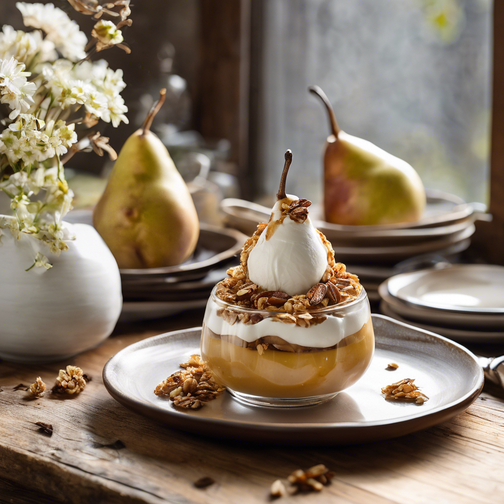 - In serving glasses or bowls, layer the roasted pear wedges, Greek yogurt, and granola, repeating the layers until the ingredients are used up.