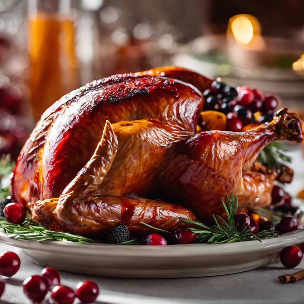 The history of Rotisserie Turkey with cranberry glaze dates back to the early American settlers who incorporated indigenous cranberries into their traditional Thanksgiving feasts. This succulent dish gained popularity in the 20th century as a modern twist on the classic roasted turkey. Renowned chefs like Julia Child and Emeril Lagasse have popularized this recipe, infusing it with their own unique flavors and techniques. Today, the best versions of this dish can be found in upscale restaurants and gourmet delis across the United States, particularly in regions known for their cranberry production such as Massachusetts and Wisconsin. The key to perfecting this dish lies in the balance of savory and sweet flavors, as well as achieving a crispy, golden-brown skin on the turkey. Whether roasted in a traditional oven or on a rotisserie, the cranberry glaze adds a delightful tangy sweetness that complements the rich, tender meat. For a unique twist, some chefs also incorporate other seasonal ingredients such as orange zest or maple syrup into the glaze, adding depth to the flavor profile.