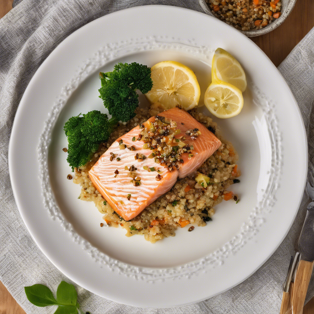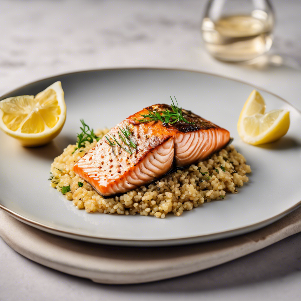 The history of the Salmon Fillet with Lemon Butter Sauce served over a bed of quinoa is a tale of culinary fusion. This dish combines the rich flavors of salmon with the light, citrusy notes of lemon butter sauce, all atop a nutritious and fluffy bed of quinoa. Originating in the Pacific Northwest, renowned for its fresh seafood, this dish has become a staple in upscale restaurants and home kitchens alike. Chefs in this region have perfected the art of grilling or pan-searing the salmon to achieve a crispy skin while keeping the flesh tender and moist. The lemon butter sauce adds a zesty and creamy element, perfectly complementing the natural flavors of the salmon. The addition of quinoa, a protein-packed ancient grain, not only enhances the dish's nutritional value but also provides a delightful textural contrast. Today, the best versions of this dish can be savored in seafood-centric eateries along the West Coast, where the proximity to the ocean ensures the freshest catch. To recreate this dish at home, sourcing high-quality salmon and mastering the art of balancing the tangy lemon butter sauce are crucial. Alternatively, some chefs opt for a Mediterranean twist by infusing the lemon butter sauce with herbs like dill or parsley, adding a refreshing and aromatic dimension to the dish. Whether enjoyed in a fine dining establishment or prepared in a cozy kitchen, the Salmon Fillet with Lemon Butter Sauce over quinoa is a harmonious marriage of flavors and textures that continues to captivate food enthusiasts worldwide.