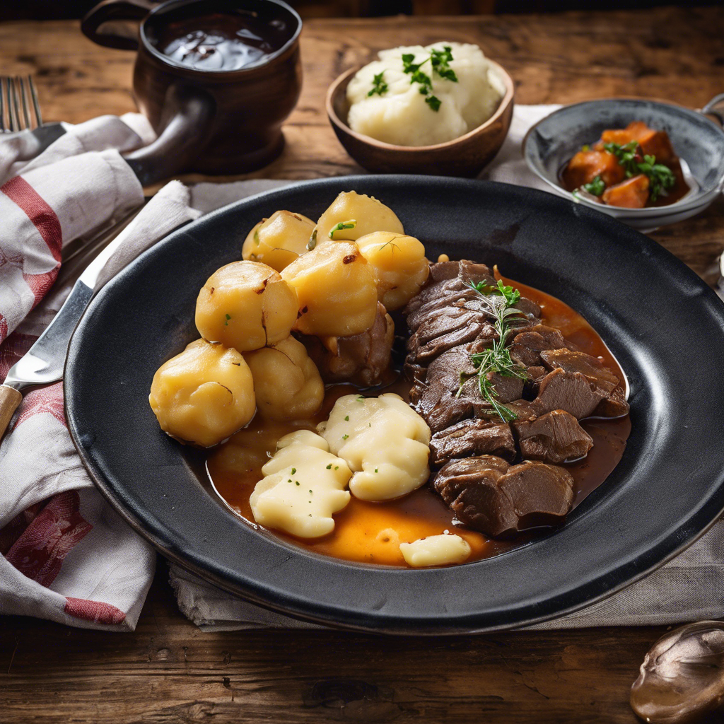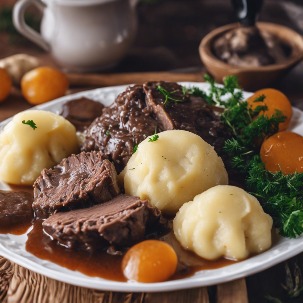 Sauerbraten with Potato Dumplings is a traditional German dish that has been enjoyed for centuries. The dish originated in the Rhineland region of Germany and has since become a staple in German cuisine. The name "Sauerbraten" translates to "sour roast," referring to the marinated and slow-cooked beef that is the centerpiece of the dish. The meat is marinated for several days in a mixture of vinegar, water, and spices, giving it a unique and tangy flavor. The dish is often served with potato dumplings, which are soft and pillowy, providing the perfect complement to the rich and savory sauerbraten. In Germany, many renowned chefs and restaurants take pride in their own versions of Sauerbraten with Potato Dumplings. The dish is often associated with cozy, family-owned taverns and restaurants in the Rhineland region, where it is prepared with time-honored recipes passed down through generations. The best version of this dish can be found in traditional German gasthauses, where the chefs meticulously marinate the beef and craft the potato dumplings with precision and care. The key to a perfect Sauerbraten with Potato Dumplings lies in the marinating process, as the beef should be tender and infused with the flavors of the marinade. Additionally, the potato dumplings should be light and fluffy, providing a delightful contrast to the robust sauerbraten. While the traditional recipe calls for beef, some variations of the dish use venison or lamb, offering a unique twist on the classic. Whether enjoyed in a quaint German tavern or prepared at home with a cherished family recipe, Sauerbraten with Potato Dumplings is a dish that embodies the heart and soul of German culinary tradition.