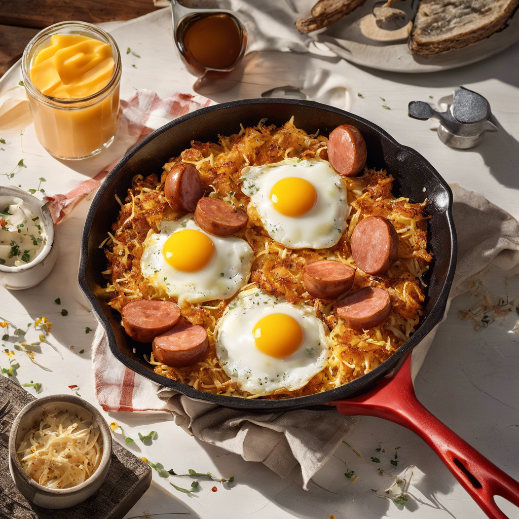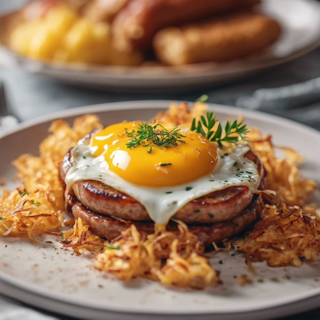 Sausage and Eggs with Melted Cheese on Crispy Hash Browns is a classic breakfast dish that has been enjoyed for generations. This hearty and satisfying meal has its roots in American diner culture, where it became a staple on breakfast menus across the country. The dish typically features savory sausage, perfectly cooked eggs, gooey melted cheese, and crispy hash browns, all layered together to create a delicious and filling breakfast experience. One of the key elements of this dish is the quality of the ingredients. The sausage should be flavorful and well-seasoned, the eggs should be cooked to perfection, and the cheese should be melted just right to create a creamy and indulgent topping. The hash browns should be crispy and golden brown, providing a satisfying crunch with each bite. In terms of regional variations, this dish can be found on breakfast menus in diners and cafes throughout the United States. Each region may put its own spin on the dish, incorporating local flavors and ingredients to make it unique to that area. For example, in the South, you might find the addition of spicy Cajun sausage, while in the Midwest, you might come across a version with smoky bacon and sharp cheddar cheese. For those looking to experience the best version of this dish, seeking out a reputable diner or breakfast spot known for their classic American fare is a good place to start. The key to a successful Sausage and Eggs with Melted Cheese on Crispy Hash Browns lies in the execution of each component, from the perfectly cooked eggs to the crispy hash browns and gooey melted cheese. When done right, this dish is a true breakfast delight that satisfies both the stomach and the soul.