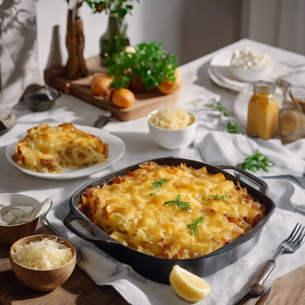 - Arrange half of the sliced potatoes in the bottom of the prepared baking dish. Pour half of the cheese sauce over the potatoes. Repeat with the remaining potatoes and cheese sauce.