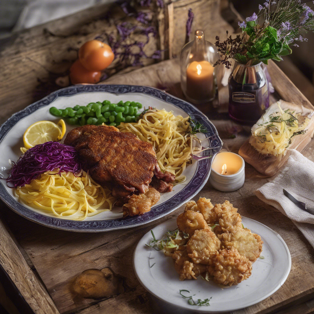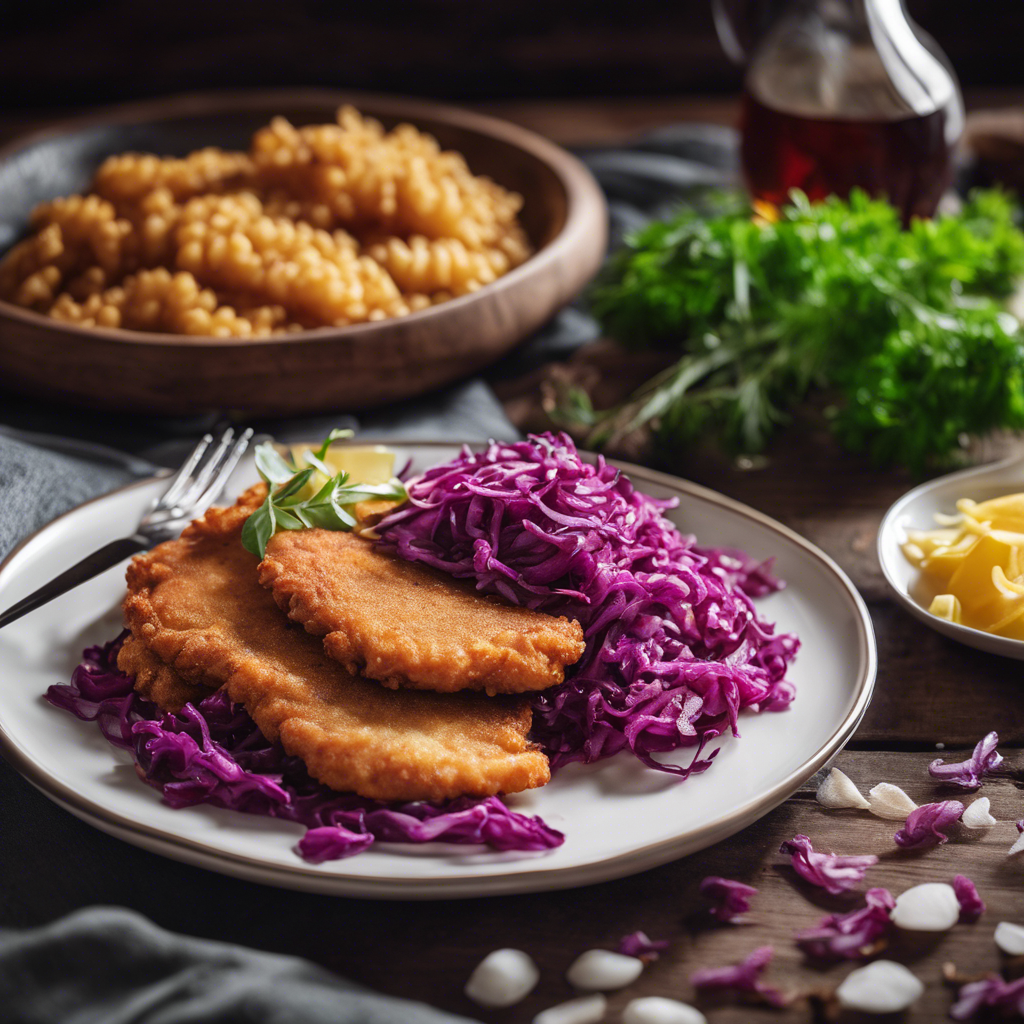 Schnitzel with Spaetzle and Red Cabbage is a classic German dish that has been enjoyed for centuries. The dish originated in Germany and has since become a beloved staple in German cuisine. The crispy, breaded schnitzel is typically made with veal or pork, pounded thin and fried to golden perfection. The tender, chewy spaetzle, a type of egg noodle, and the tangy, sweet red cabbage perfectly complement the rich flavors of the schnitzel. This hearty and comforting dish is often associated with Bavarian cuisine and is a favorite in beer gardens and traditional German restaurants. Today, the best versions of this dish can be found in authentic German eateries, where skilled chefs prepare the schnitzel to crispy perfection and the spaetzle to a tender, chewy texture. The key to getting this dish right lies in the preparation of the schnitzel, ensuring it is perfectly crispy on the outside and tender on the inside. While the traditional method of frying the schnitzel is most popular, some chefs also offer a healthier alternative by baking the schnitzel. This dish is a must-try for anyone looking to experience the rich flavors and comforting warmth of German cuisine.