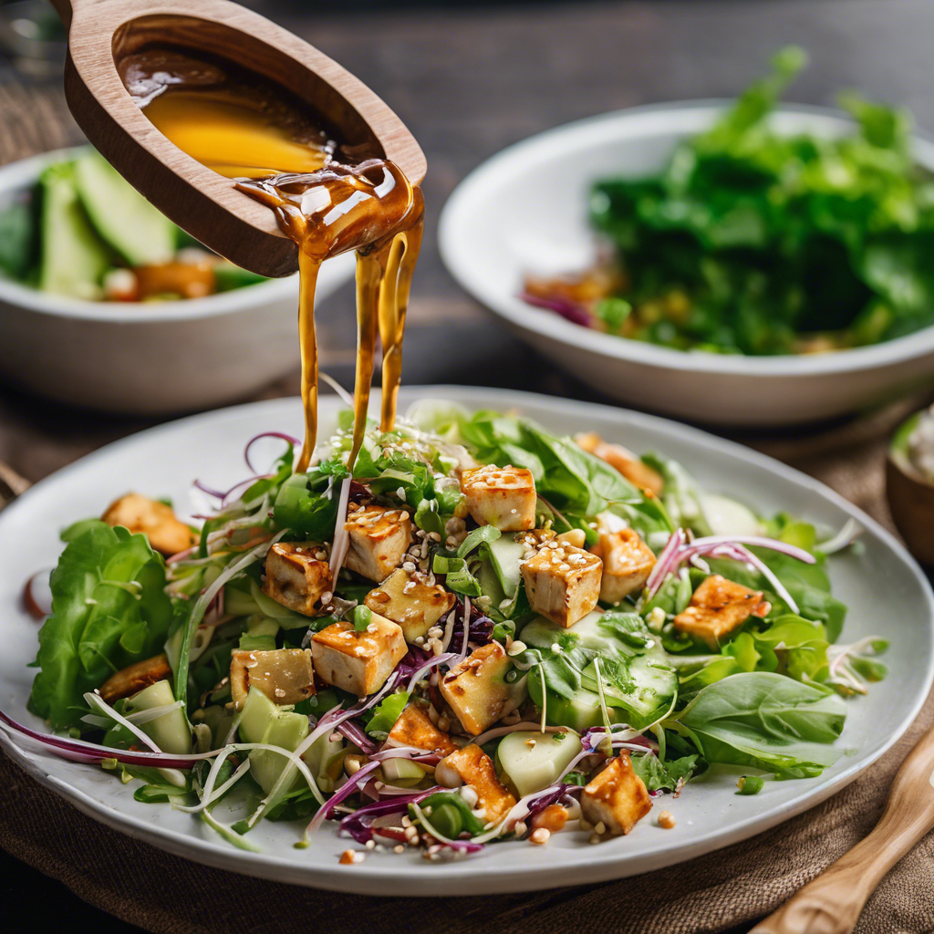 - Add the cooked tofu to the salad bowl and drizzle the sesame ginger dressing over the salad. Toss gently to coat all the ingredients with the dressing.