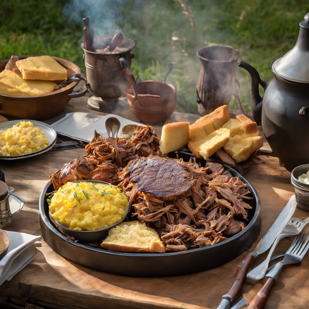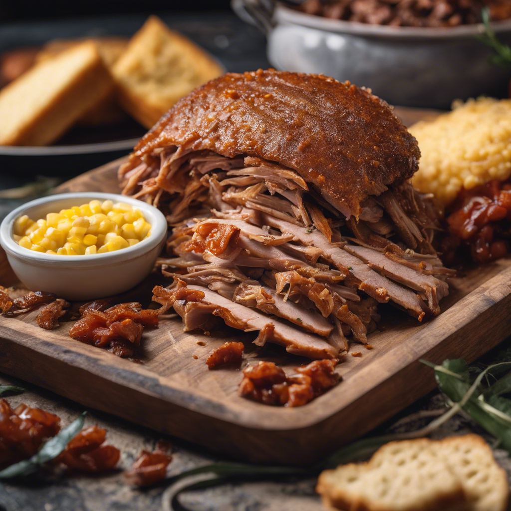 The Smoked Pulled Pork Platter with a side of cornbread has a rich history rooted in Southern barbecue traditions. This iconic dish features tender, hickory-smoked pulled pork, slow-cooked to perfection and infused with a smoky flavor. The succulent pork is often seasoned with a blend of spices and then hand-pulled to achieve its signature texture. The accompanying side of cornbread adds a delightful sweetness and crumbly texture that perfectly complements the savory pork. This classic combination is a staple in Southern cuisine, with renowned barbecue joints in regions like Texas, Tennessee, and the Carolinas serving up their own unique takes on this beloved dish. For the best version of this dish, seek out a restaurant with a pitmaster who has honed their smoking technique to achieve that perfect balance of tenderness and smokiness in the pork. The key to getting this dish right lies in the quality of the pork, the slow smoking process, and the art of seasoning. Whether it's served on a platter with a side of cornbread or in a sandwich, the Smoked Pulled Pork Platter remains a timeless favorite for barbecue enthusiasts.