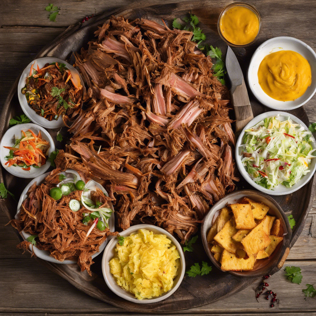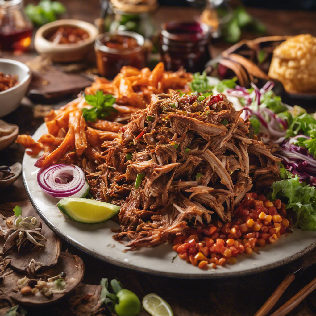 The history of the Smoked Pulled Pork Platter with a spicy barbecue sauce can be traced back to the southern United States, where barbecue traditions run deep. This dish has its roots in the slow-cooking techniques of the South, where pork is smoked for hours over hickory or oak wood to achieve a tender, flavorful result. The addition of a spicy barbecue sauce adds a kick of heat and tangy flavor to the succulent pulled pork. Renowned chefs like Aaron Franklin in Texas and Rodney Scott in South Carolina have elevated the art of smoking and saucing pork, influencing the modern interpretation of this classic dish. Today, the best versions of this dish can be found in authentic barbecue joints across the South, where pitmasters take pride in their time-honored techniques. To make this dish at home, it's crucial to get the smoking process just right, ensuring the pork is infused with rich, smoky flavors. Additionally, crafting a balanced spicy barbecue sauce with the perfect blend of heat, sweetness, and tang is essential for a memorable dining experience. Whether enjoyed on a platter with classic sides like coleslaw and cornbread or in a sandwich, the Smoked Pulled Pork with a spicy barbecue sauce is a beloved staple of Southern cuisine.