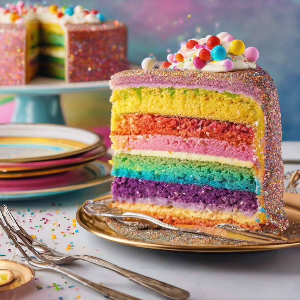 - Slice and serve the sparkling rainbow cake. Enjoy!