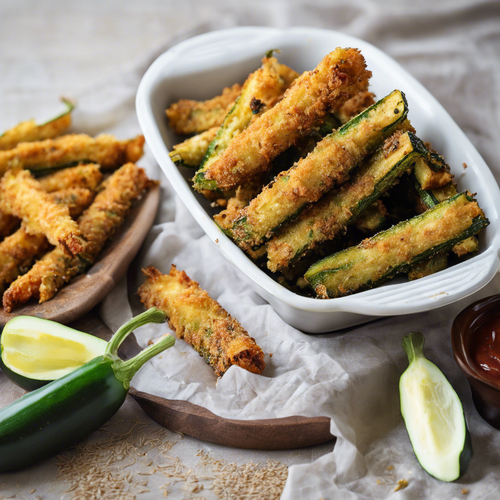 - Dip each zucchini strip into the beaten eggs, then coat with the breadcrumb mixture, pressing gently to adhere the coating to the zucchini.