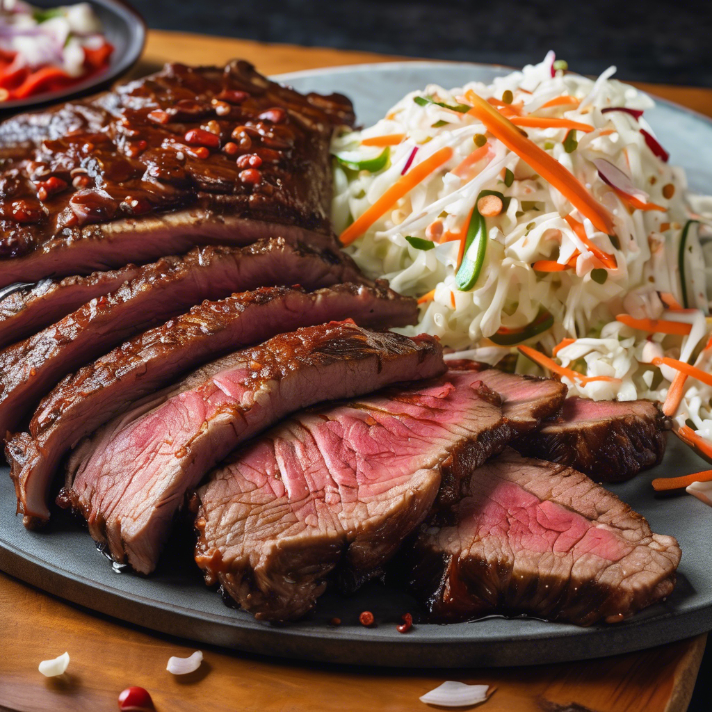 The Spicy Chipotle Glazed BBQ Beef Brisket is a mouthwatering dish that originated in the southern United States. This delectable dish features tender beef brisket, slow-cooked to perfection and smothered in a spicy chipotle BBQ glaze. The dish is often served with a side of creamy coleslaw, adding a cool and refreshing contrast to the bold flavors of the brisket. This dish has become a staple in many BBQ joints and restaurants across the southern region, where talented chefs have perfected the art of smoking and grilling the brisket to achieve that irresistible tenderness and smoky flavor. The spicy chipotle glaze adds a kick of heat and depth of flavor, elevating the dish to new heights. The creamy coleslaw, with its crisp and tangy profile, provides the perfect accompaniment to the rich and spicy brisket, creating a harmonious balance of flavors and textures. For the best version of this dish, head to renowned BBQ establishments in Texas, Tennessee, or Kansas City, where pitmasters have honed their skills in crafting the perfect Spicy Chipotle Glazed BBQ Beef Brisket. The key to getting this dish right lies in the quality of the brisket, the slow cooking process, and the bold flavors of the chipotle glaze. Alternatively, home cooks can experiment with different smoking techniques and homemade chipotle BBQ sauces to create their own unique spin on this classic dish.