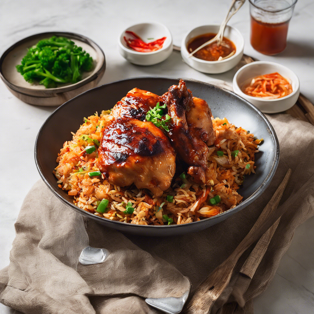 The history of Spicy Gochujang Marinated Chicken Thighs with a side of kimchi fried rice can be traced back to the vibrant and flavorful cuisine of South Korea. This dish is a modern twist on traditional Korean flavors, combining the heat of gochujang with the succulent tenderness of chicken thighs. The marinade, made with gochujang, soy sauce, garlic, and ginger, infuses the chicken with a spicy, umami-rich flavor. The kimchi fried rice, a staple in Korean cuisine, adds a tangy and slightly sour note to the dish, complementing the heat of the chicken. This dish has gained popularity in Korean fusion restaurants around the world, with chefs putting their own unique spin on the classic flavors. One renowned restaurant known for its exceptional Spicy Gochujang Marinated Chicken Thighs with kimchi fried rice is located in the bustling streets of Seoul. The chef, known for his innovative approach to traditional Korean dishes, has perfected the art of marinating the chicken thighs to tender perfection while infusing them with the bold flavors of gochujang. The kimchi fried rice, prepared with aged kimchi and a medley of aromatic spices, serves as the ideal accompaniment to the fiery chicken. To create the best version of this dish, it's crucial to ensure that the chicken thighs are marinated for an adequate amount of time to allow the flavors to fully penetrate the meat. Additionally, using high-quality gochujang and authentic Korean kimchi is essential to achieving an authentic and delicious flavor profile. For a unique twist, some chefs incorporate additional ingredients such as honey or sesame oil to balance the spiciness of the dish. For those looking to explore alternative methods, a popular variation involves grilling the marinated chicken thighs to impart a smoky charred flavor, adding another layer of complexity to the dish. Additionally, some chefs opt to incorporate diced vegetables such as bell peppers and onions into the kimchi fried rice for added texture and depth of flavor. The best version of this dish can be found in restaurants that prioritize using authentic Korean ingredients and techniques, ensuring that the flavors remain true to the roots of Korean cuisine. Whether enjoyed in a bustling eatery in Seoul or recreated at home with a personal touch, Spicy Gochujang Marinated Chicken Thighs with kimchi fried rice is a delightful fusion of spicy, savory, and tangy flavors that pays homage to the rich