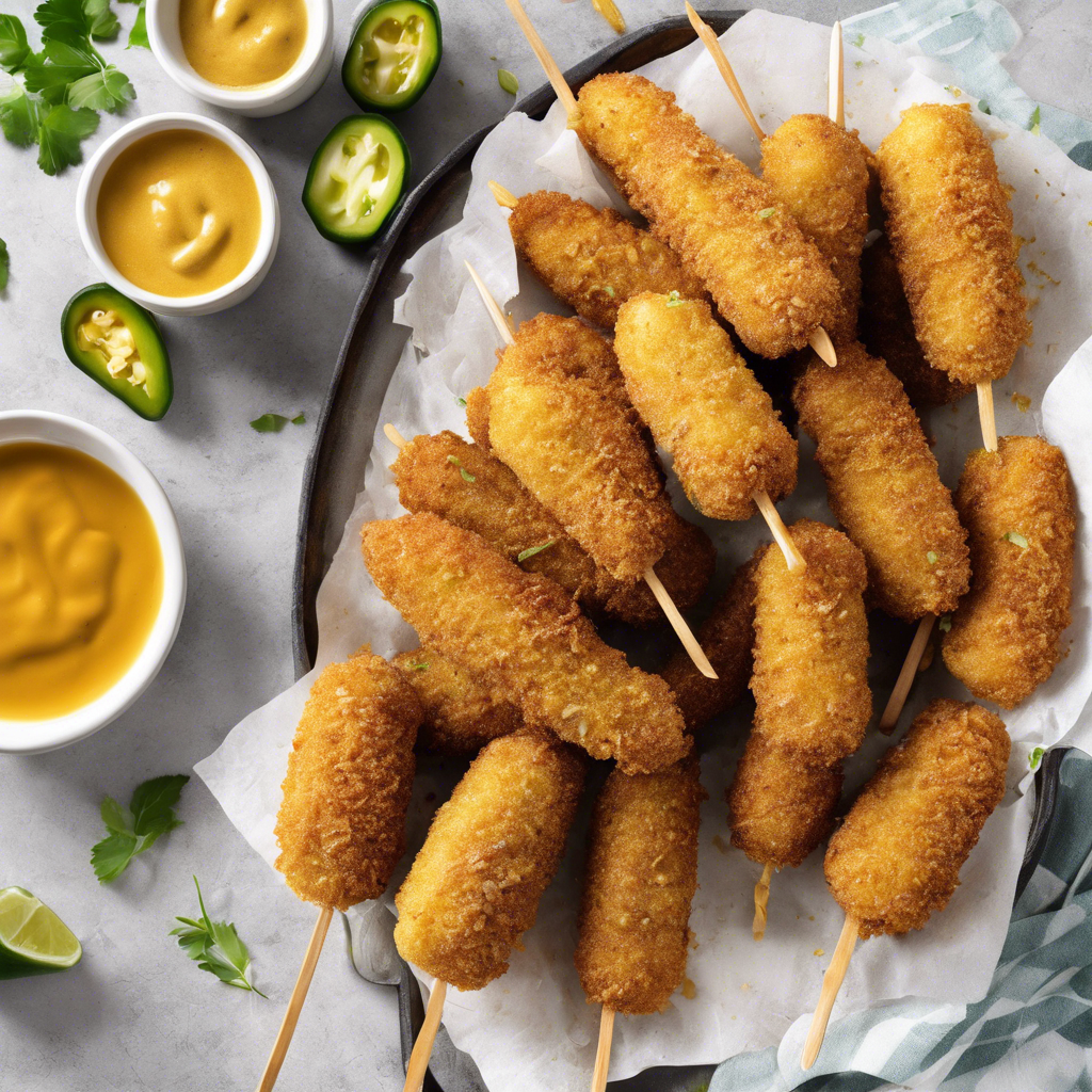 The Spicy Jalapeno Potato Chip Crusted Corn Dogs with a honey mustard drizzle have a rich history rooted in American carnival and fair food culture. This unique twist on the classic corn dog first gained popularity in the Southern United States, where chefs sought to elevate the traditional corn dog by adding a spicy kick and a sweet and tangy honey mustard drizzle. The dish gained widespread attention when it was featured at the Texas State Fair, where it quickly became a fan favorite. The combination of the crispy, spicy jalapeno potato chip crust and the savory, juicy hot dog, paired with the sweet and zesty honey mustard drizzle, created a flavor explosion that captured the hearts of food enthusiasts across the country. Today, the best versions of this dish can be found at state fairs, food festivals, and specialty food trucks that specialize in gourmet carnival fare. The key to getting this dish right lies in the balance of flavors - the heat from the jalapeno potato chip crust should complement the smoky hot dog, while the honey mustard drizzle adds a delightful contrast of sweetness and tanginess. For those looking to recreate this dish at home, it's essential to select high-quality hot dogs and to carefully coat them in a mixture of crushed spicy jalapeno potato chips for that perfect crunch. The honey mustard drizzle can be customized to suit individual preferences, whether it's a thicker, creamier consistency or a lighter, more tangy flavor profile. Overall, the Spicy Jalapeno Potato Chip Crusted Corn Dogs with a honey mustard drizzle offer a delightful fusion of flavors and textures, making them a must-try for anyone looking to experience the excitement of carnival cuisine with a gourmet twist.
