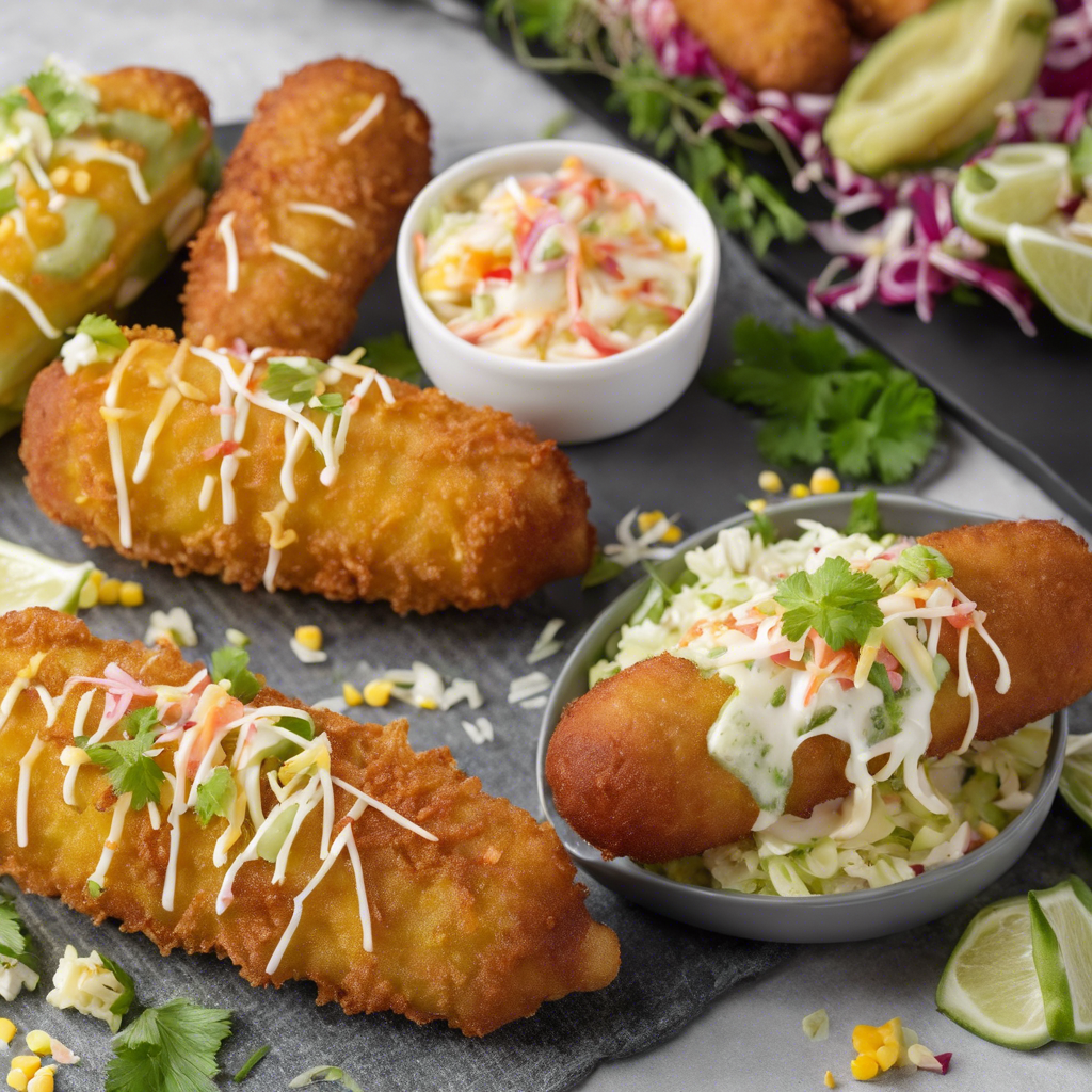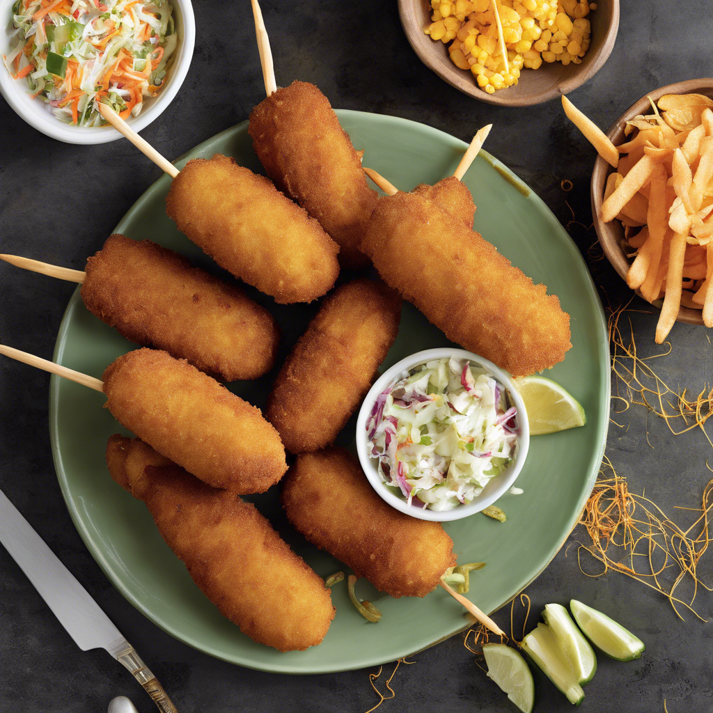 The Spicy Jalapeno Potato Chip Crusted Corn Dogs with a side of coleslaw is a mouthwatering fusion of flavors and textures. Originating in the southern United States, this dish combines the classic corn dog with a spicy twist. The crispy, golden-brown exterior is achieved by coating the corn dog in crushed jalapeno potato chips, adding a fiery kick to every bite. The accompanying coleslaw provides a refreshing contrast with its creamy, tangy dressing and crunchy cabbage. This dish has gained popularity in trendy gastropubs and food trucks, where innovative chefs have put their own spin on the traditional recipe. For the best version of this dish, head to the bustling food scene of Austin, Texas, where food enthusiasts flock to savor this delectable creation. The key to perfecting this dish lies in the balance of heat from the jalapeno chips and the comforting familiarity of a classic corn dog, complemented by the zesty coleslaw. Whether enjoyed as a snack or a main course, this dish is a must-try for anyone seeking a tantalizing culinary experience.