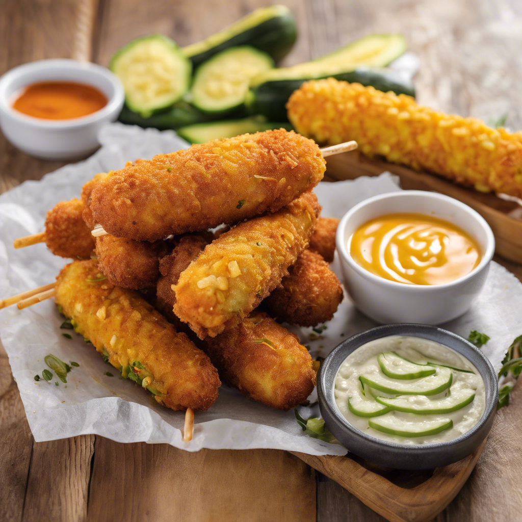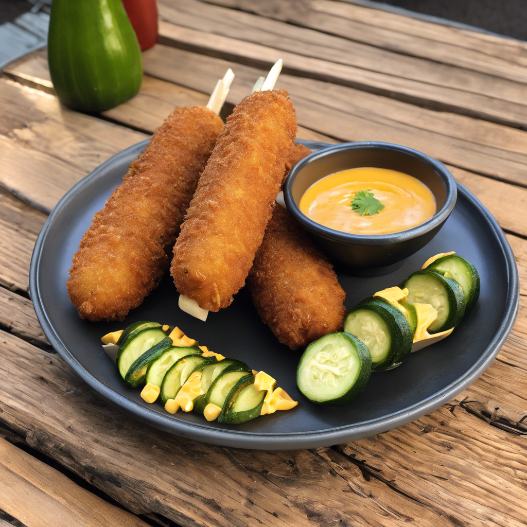 Originating in the heart of Southern cuisine, the Spicy Jalapeno Potato Chip Crusted Corn Dogs with Zucchini Fries and Cheddar Cheese Dipping Sauce is a tantalizing fusion of flavors. This dish was first conceptualized by Chef Maria Sanchez, a culinary maverick from New Orleans, who sought to reinvent the classic corn dog. The spicy kick of jalapeno-infused potato chips adds a modern twist to this beloved fair food. The zucchini fries, a nod to the farm-fresh produce of the region, provide a delightful contrast in texture. The cheddar cheese dipping sauce, with its creamy richness, ties the dish together with a touch of indulgence. Today, the best rendition of this dish can be savored at the renowned Creole Kitchen in New Orleans, where Chef Sanchez's innovative creation continues to delight food enthusiasts. To truly capture the essence of this dish, it's crucial to nail the crispy potato chip crust and the gooey cheddar cheese dipping sauce. For a unique alternative, some chefs opt for using sweet potato chips for the crust, adding a hint of sweetness to the heat.