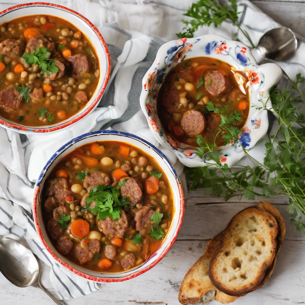 Spicy Sausage and Lentil Soup is a hearty and flavorful dish with a rich history. This comforting soup has its roots in Italian and Mediterranean cuisine, where it has been enjoyed for generations. The dish typically features spicy Italian sausage, earthy lentils, aromatic vegetables, and a blend of savory herbs and spices. In Italy, renowned chefs like Lidia Bastianich and Mario Batali have popularized their own versions of this classic soup, incorporating regional ingredients and culinary techniques. In the United States, Italian-American restaurants and delis often serve up steaming bowls of Spicy Sausage and Lentil Soup, drawing inspiration from the traditional recipes of their ancestors. The key to a delicious Spicy Sausage and Lentil Soup lies in the quality of the sausage and the balance of flavors. The spicy kick of the sausage complements the earthy lentils, while the aromatic vegetables and herbs add depth to the broth. For a twist on the classic recipe, some chefs may use alternative proteins like chorizo or add a splash of red wine for extra richness. Today, some of the best versions of this dish can be found in authentic Italian trattorias and family-owned restaurants that take pride in their homemade soups. Whether enjoyed as a comforting meal on a chilly evening or as a starter in a gourmet dining experience, Spicy Sausage and Lentil Soup continues to be a beloved staple in the culinary world.