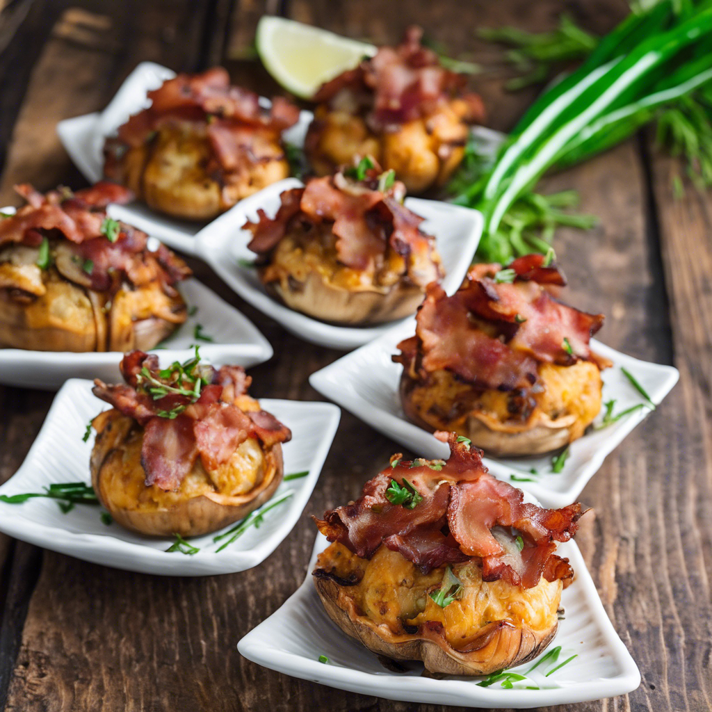 The Spicy Sriracha Crab Stuffed Mushrooms with a sprinkle of crispy bacon on top is a tantalizing dish that originated in the coastal regions of the United States. This delectable appetizer combines the richness of crab meat with the earthy flavors of mushrooms, all elevated by the fiery kick of Sriracha sauce. The dish has gained popularity in recent years, thanks to its perfect balance of heat and savory flavors. Chefs across the country have put their own spin on this dish, making it a staple in seafood restaurants and upscale eateries. For the best version of this dish, head to renowned seafood restaurants in coastal cities, where fresh crab meat and locally sourced mushrooms take center stage. The key to perfecting this dish lies in the quality of the crab meat and the precise balance of Sriracha to achieve that ideal level of spiciness. For a famous alternative method, some chefs opt for grilling the stuffed mushrooms to impart a smoky flavor, adding another layer of complexity to this already irresistible dish.